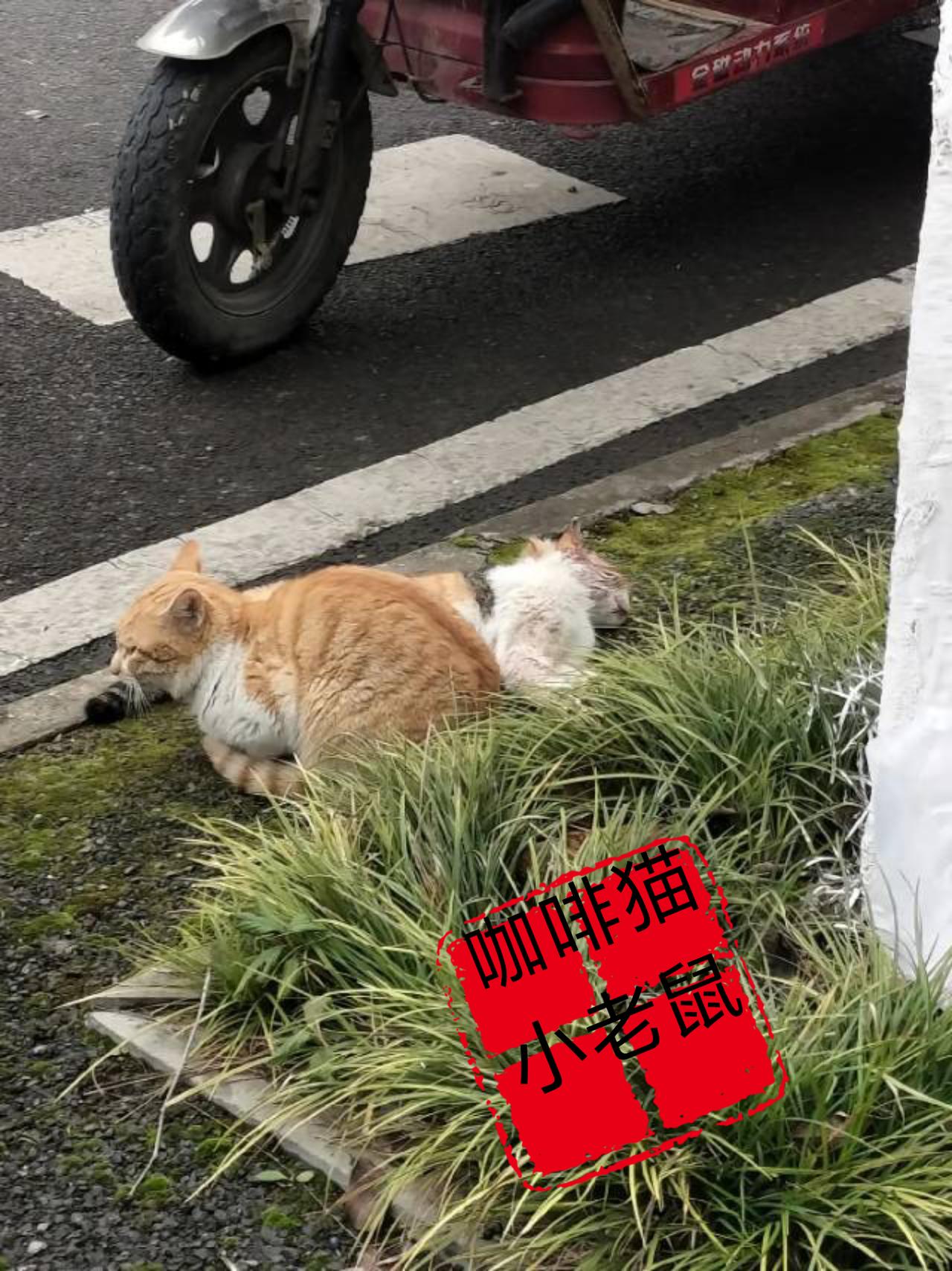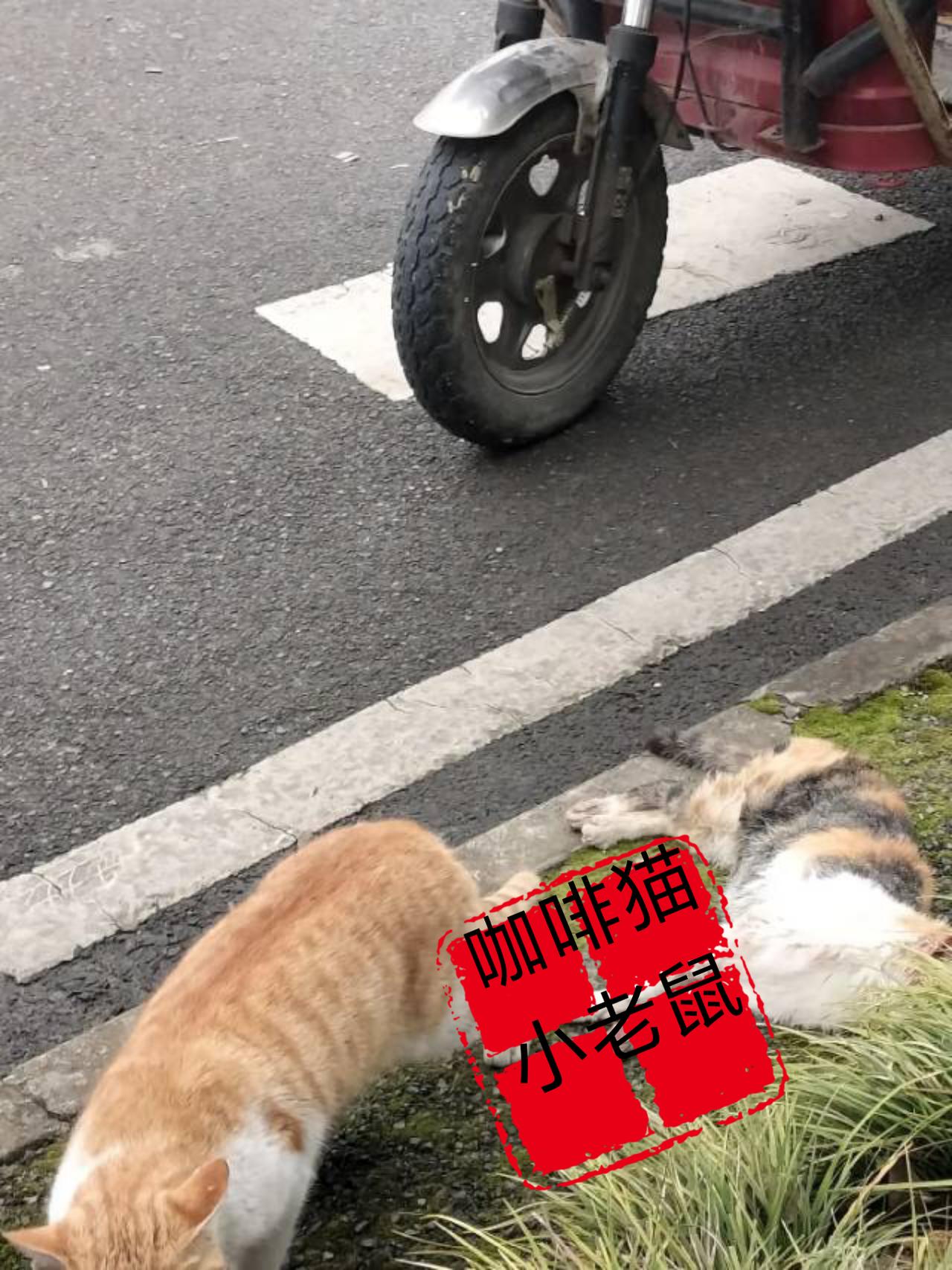 两只流浪猫正在马路边吃着别人丢弃在地上的食物,可就在这时意外却突然降临到了她们其中一只流浪猫的身上!