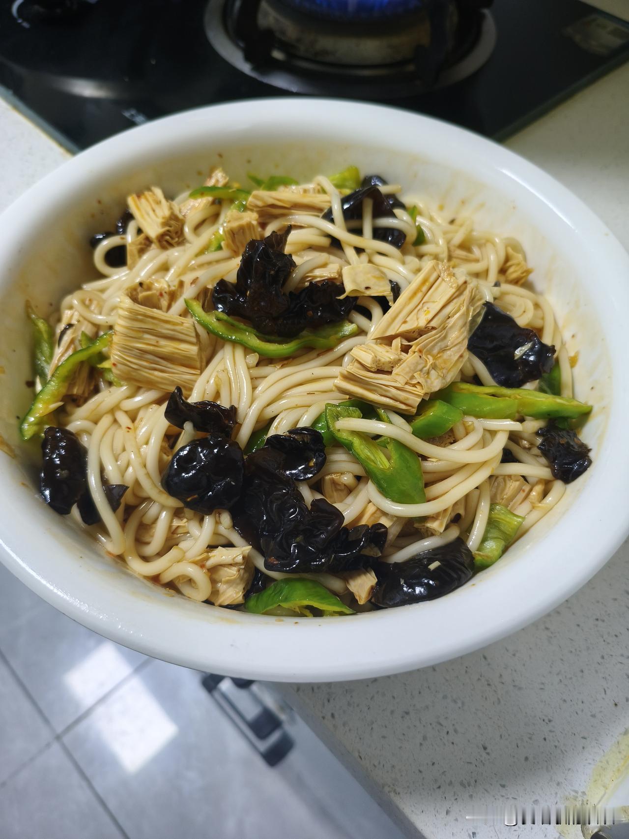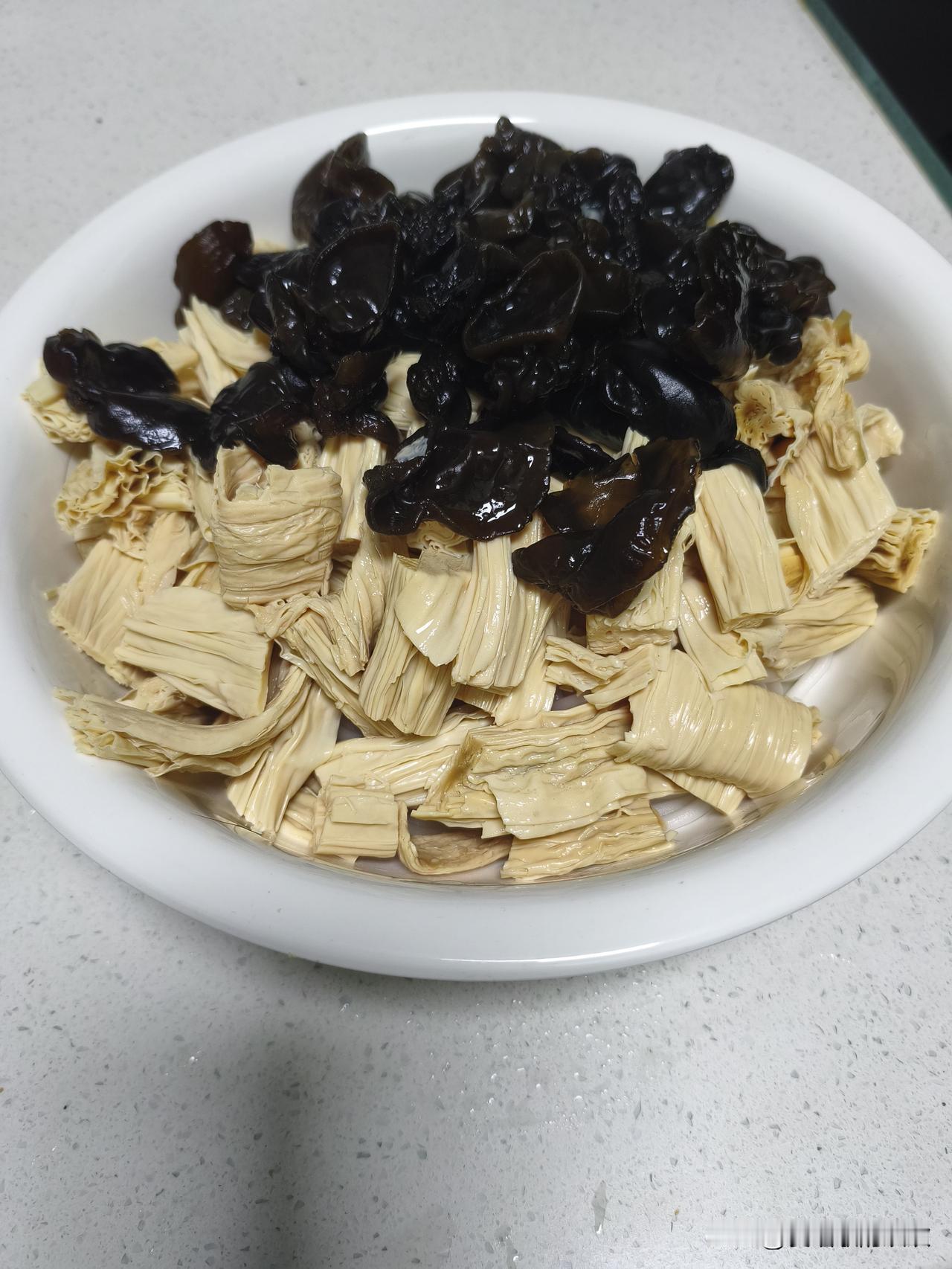 中午饭,我用3月份,我从甘肃兰州带来的洋芋粉条和网购的腐竹、木耳凉拌了一个凉拌菜。