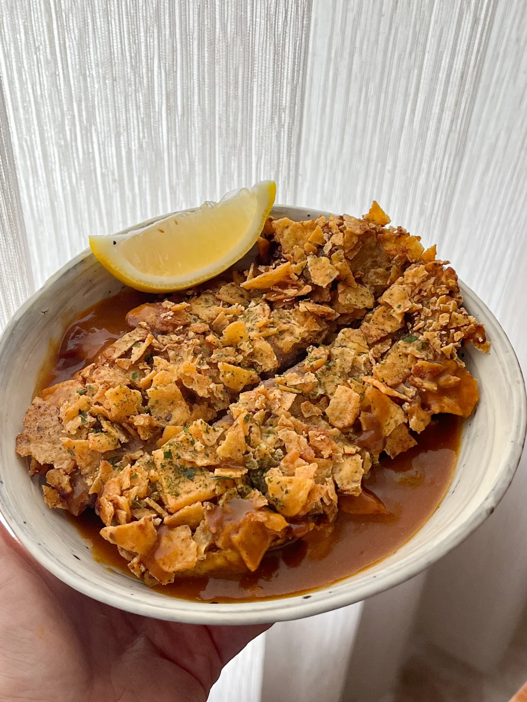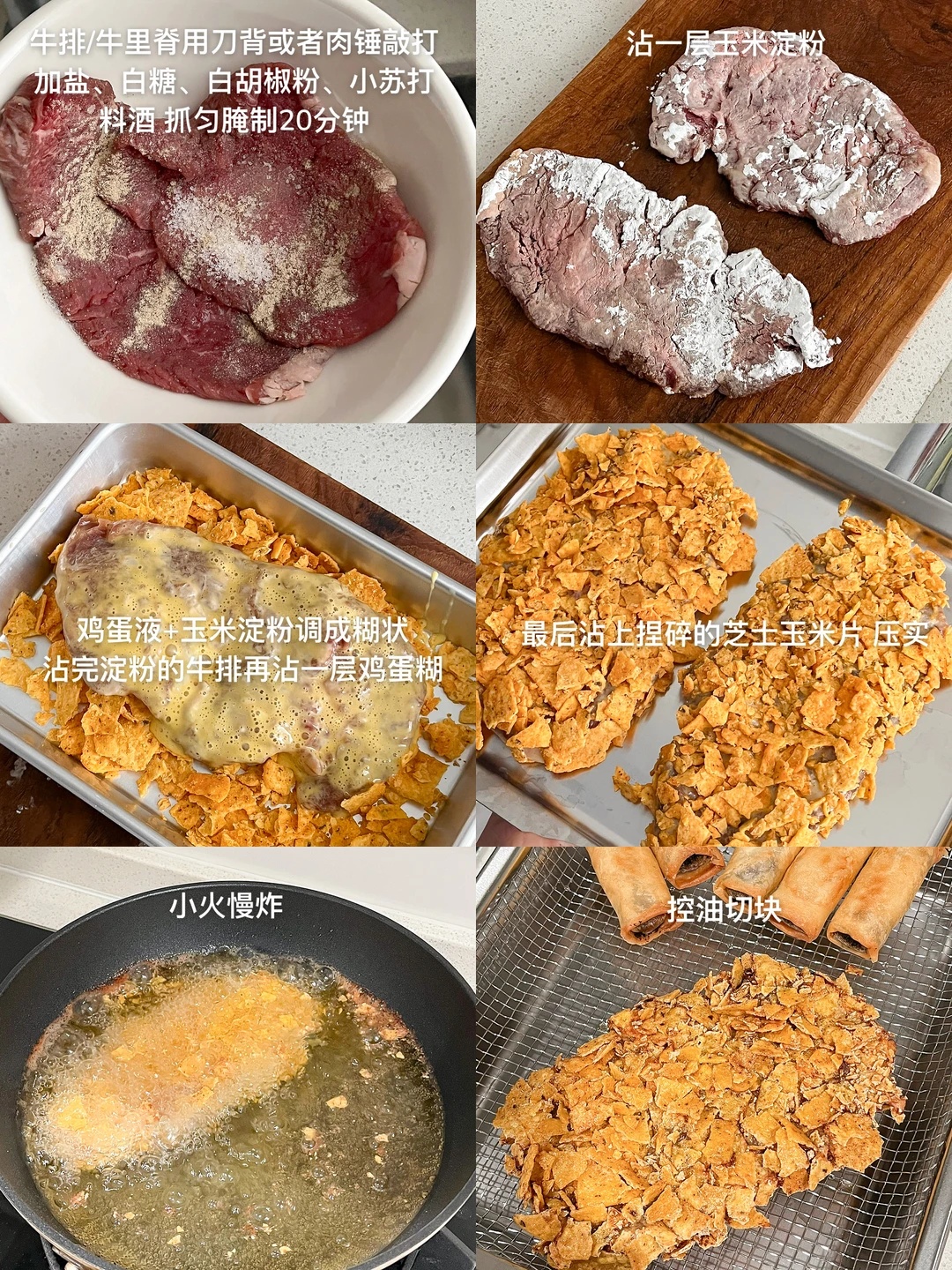 依次沾上玉米淀粉、鸡蛋糊、玉米片