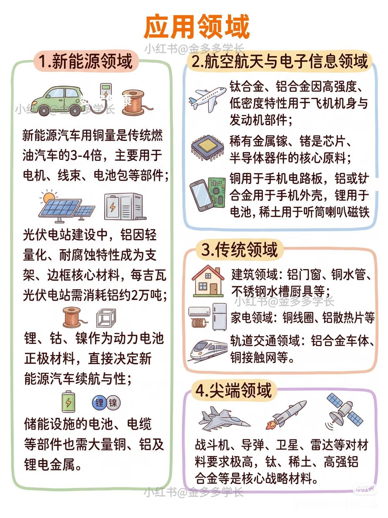 - 新能源:新能源车用铜量是油车的3-4倍,锂钴镍是电池核心,光伏要铝要铜;