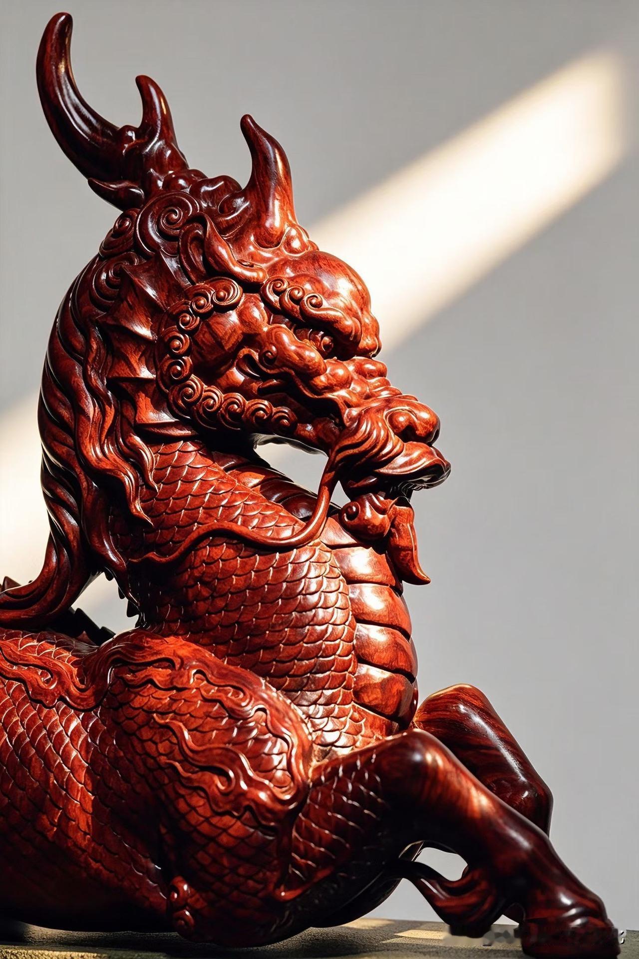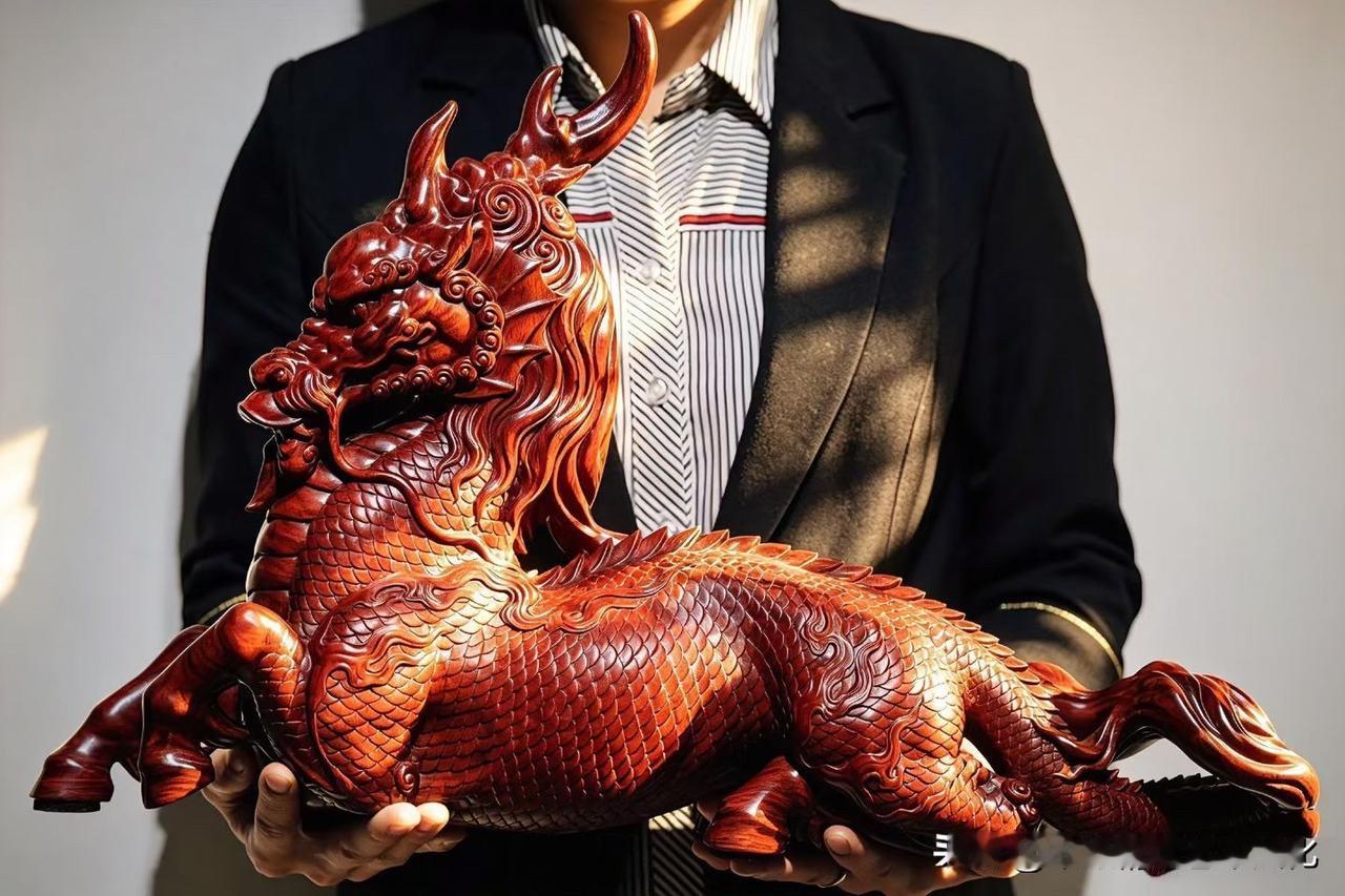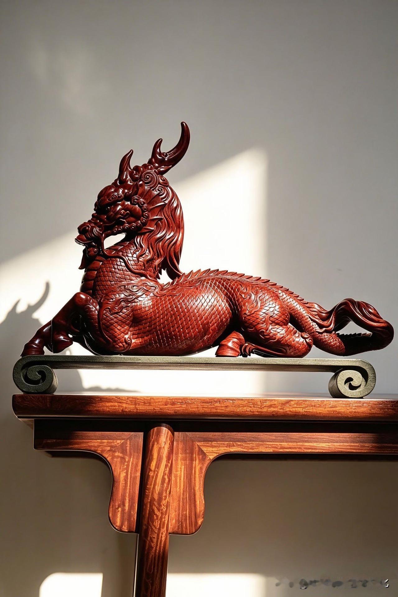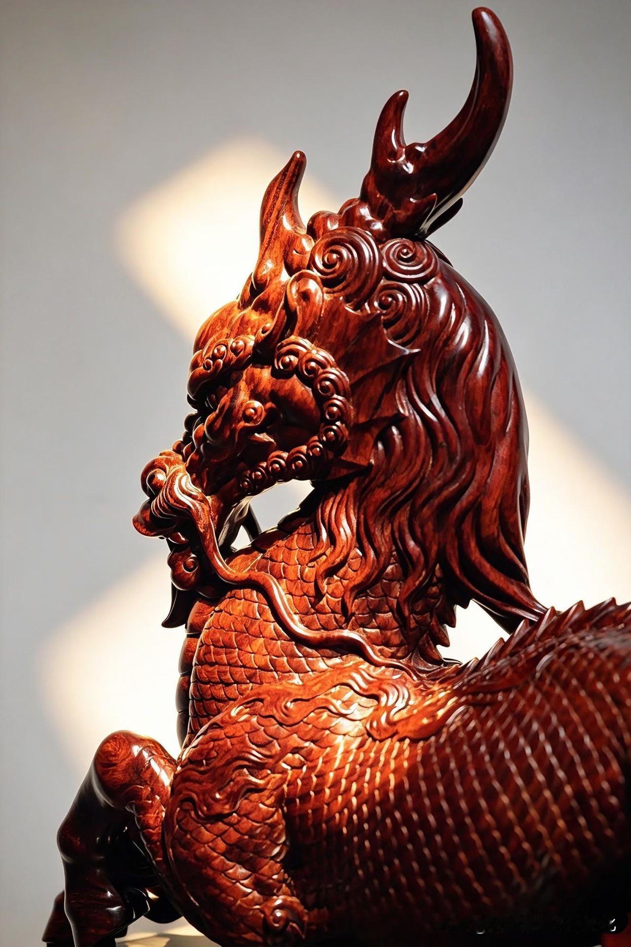 这尊麒麟,以小叶紫檀整料而成,木色深沉中透着油润的光,星点隐现,像夜里未散的火。形体开张有度,胸腹饱满却不滞,筋骨内藏,一眼就是“立得住”的东西。