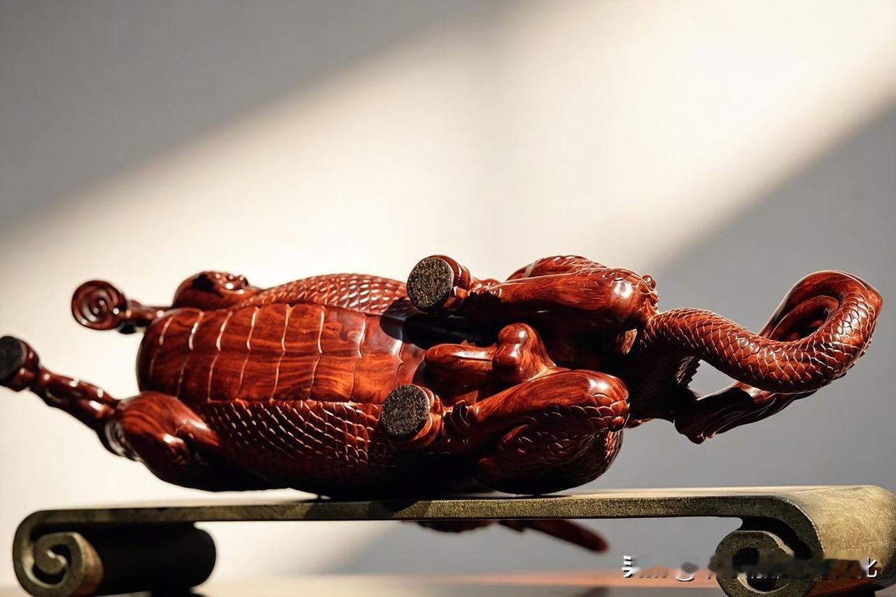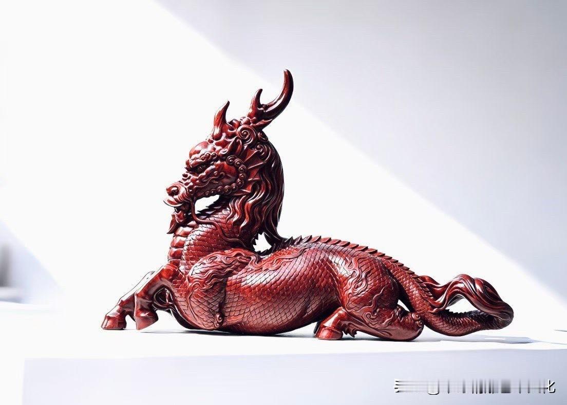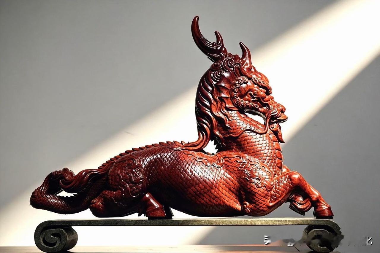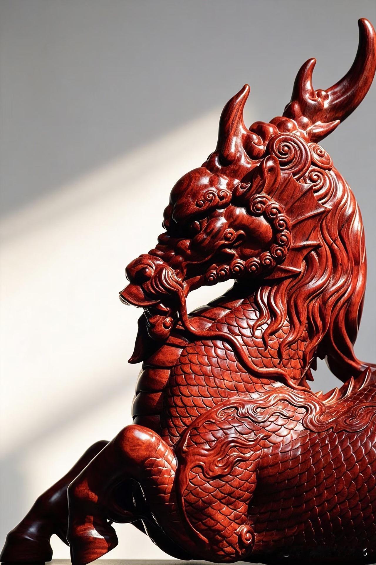 这尊麒麟,以小叶紫檀整料而成,木色深沉中透着油润的光,星点隐现,像夜里未散的火。形体开张有度,胸腹饱满却不滞,筋骨内藏,一眼就是“立得住”的东西。