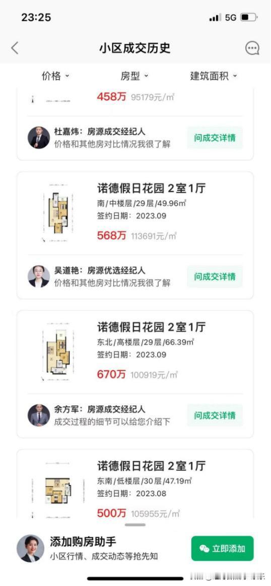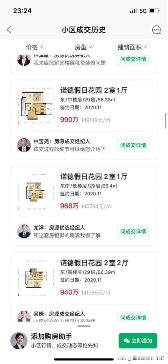深圳的诺德假日花园,这个小区在2019年9月的时候,小区66平的房子,房价只有94000多元,等到了2020年11月的时候,小区66平的房子成交价已经是在140000多元了,而等到了2023年9月的时候,单价已经跌到了10万一平,现在小区房价跌的就更惨了。