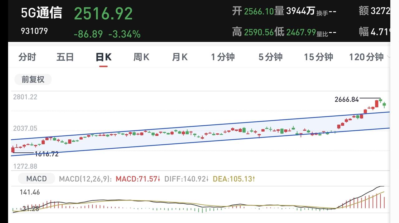 3:5G通信板块前段时间上涨突破了日线级别上涨通道的上轨线,进入了加速上涨走势。最近的两个交易日都是回落,今天的下跌幅度比较大,但还是处于这个上涨通道的上方,这个板块还是处于上涨趋势中,短线持有的可以继续持有。