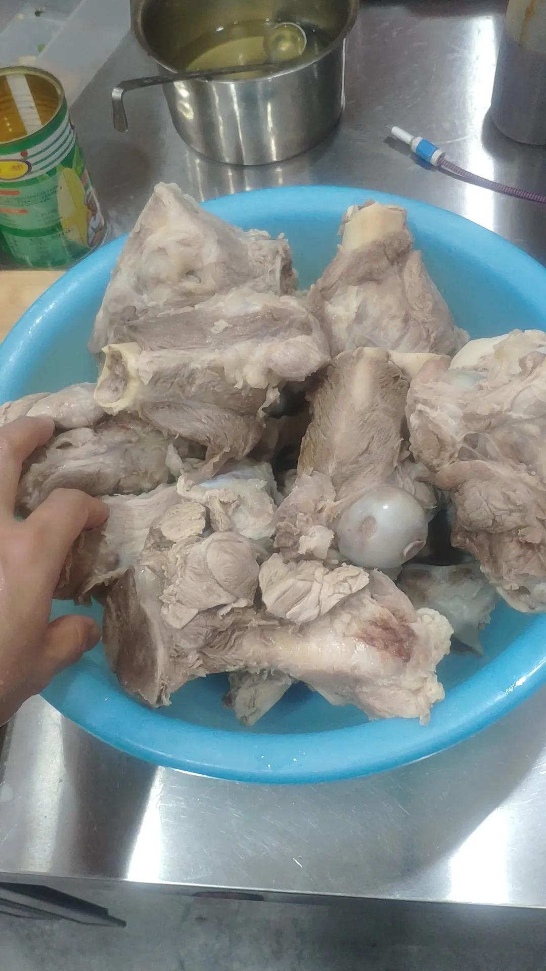 第一步:去血水。 棒骨买回来后,先拿清水泡,加点小苏打、加点盐,泡它个半小时。这步别偷懒,血水去干净了,后面才不腥。泡完多冲洗几遍,洗到水清为止。