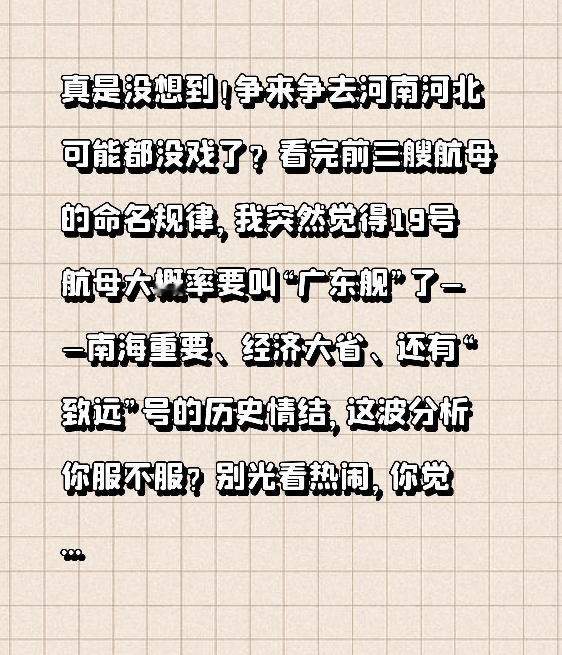 真是没想到!争来争去河南河北可能都没戏了?看完前三艘航母的命名规律,我突然觉得19号航母大概率要叫“广东舰”了——南海重要、经济大省、还有“致远”号的历史情结,这波分析你服不服?