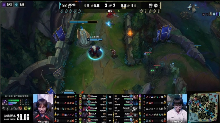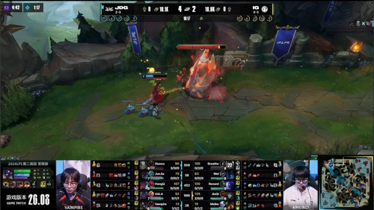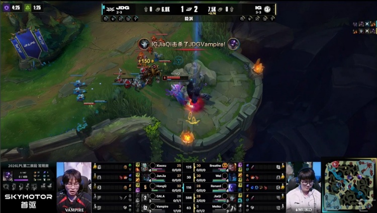 [15:10]先锋团,Meiko泰坦龙坑之上被HongQ永恩隔墙砍掉后二段E飞回逃生,随后HongQ上路再砍Breathe杰斯,Wei梦魇关灯飞上反送Junjia茂凯人头,HongQ残血再击飞Renard瑞兹送Junjia茂凯双杀,JDG打出0换4。