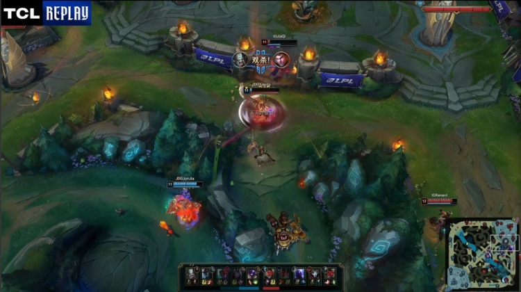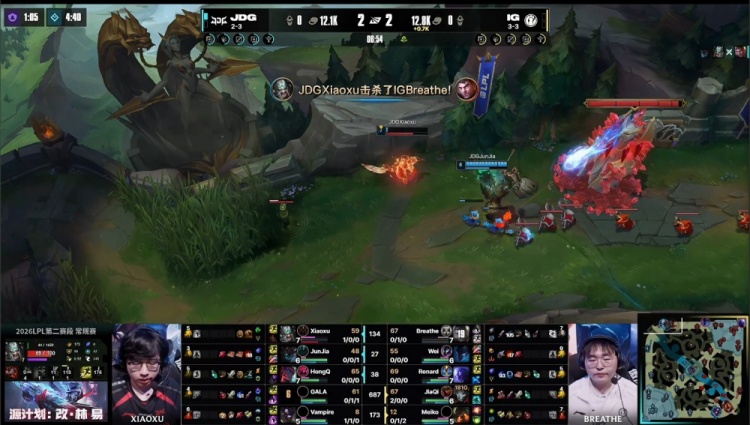[23:33]野区团战,Renard瑞兹换掉GALA韦鲁斯,HongQ永恩与小徐蛮王砍爆iG,JDG打出1换4,推掉iG中路水晶撤退。