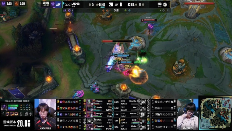 [17:24]小龙团,Wei潘森见面被杀,小徐蛮王大招在手狂砍双杀,JiaQi烬高地架狙配合Renard击杀小徐,HongQ永恩再砍Renard得手,JDG打出1换3。随后Wei自家野区迷路再送一个,JDG经济领先5k。