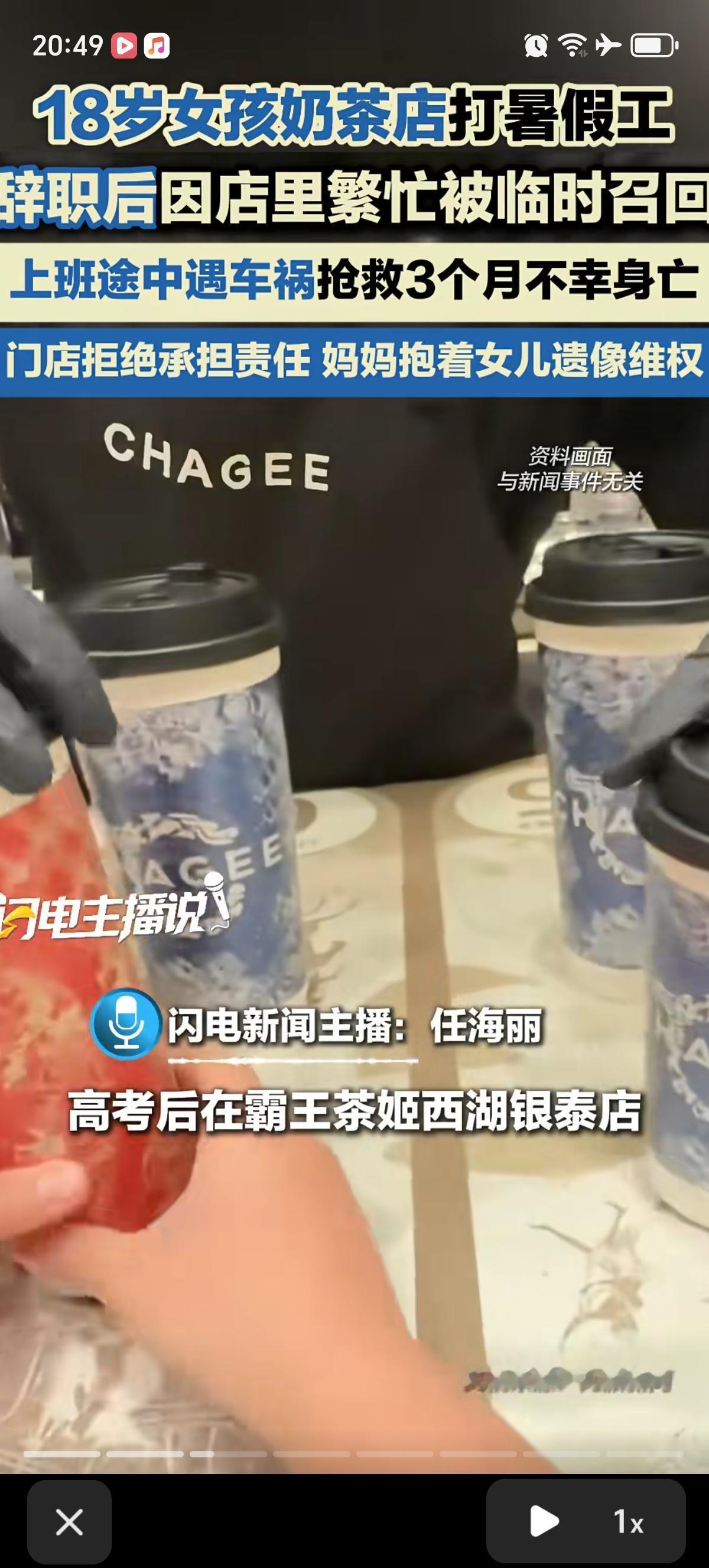 女孩的妈妈讲自己女儿高考后在霸王茶姬西湖银泰店兼职暑期工,打算攒钱旅游。女儿辞职后因为门店业务繁忙,店家让她回去再上几天班,没想到上班途中遭遇车祸,因多器官衰竭离世。