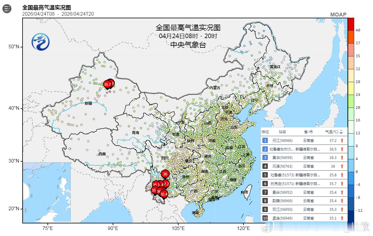 【气温】今天云南部分站点以及新疆吐鲁番盆地,出现35℃以上高温。今天华南因为阴雨降温,最高气温甚至低于东北。比如广州只有20℃,哈尔滨21.2℃。哈尔滨也创出今年气温新高,也是今年首次上20℃。不过明天黑龙江等地因为冷涡活动,导致气温下降,华南降雨过后,气温回升。