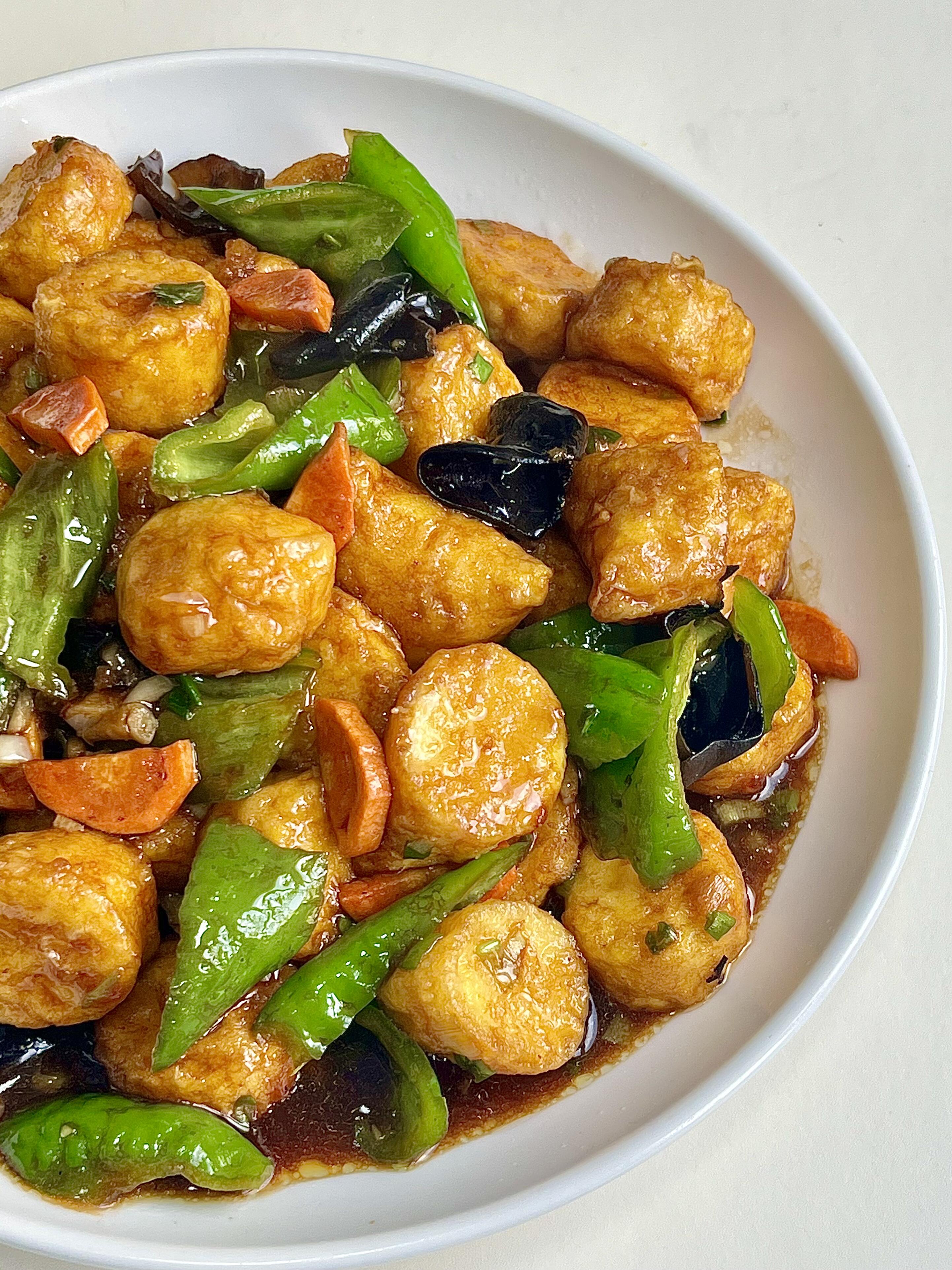 5)焖煮入味:倒入调好的料汁,放入煎好的鸡蛋豆腐,大火焖煮片刻,让每一块豆腐都吸足汤汁,期间可以轻轻翻动豆腐,确保均匀入味。