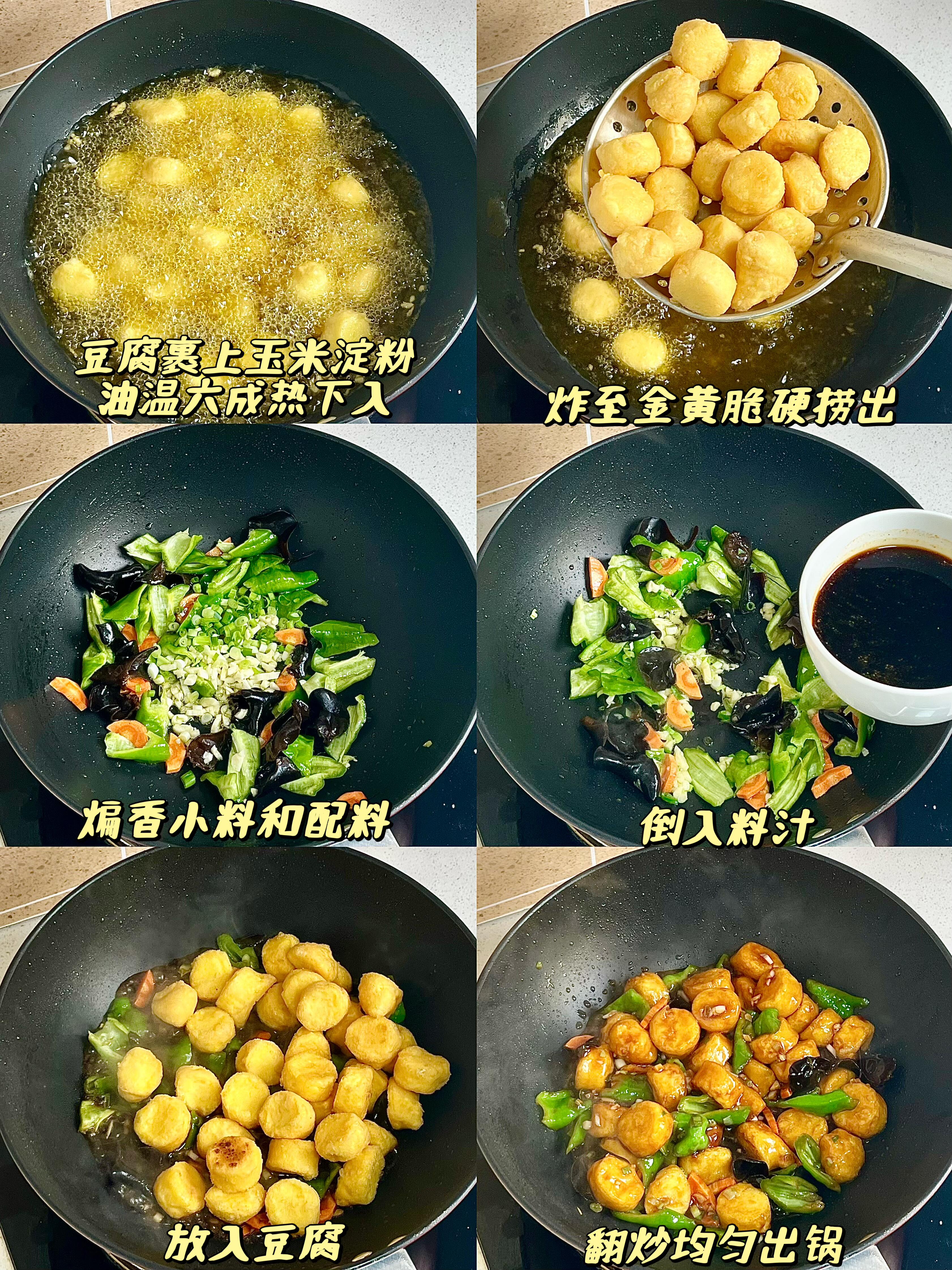 3)煎制豆腐:起锅烧油,鸡蛋豆腐表面均匀裹上一层玉米淀粉,待油温六成热时,下入豆腐,小火慢煎至表面金黄脆硬,捞出备用。