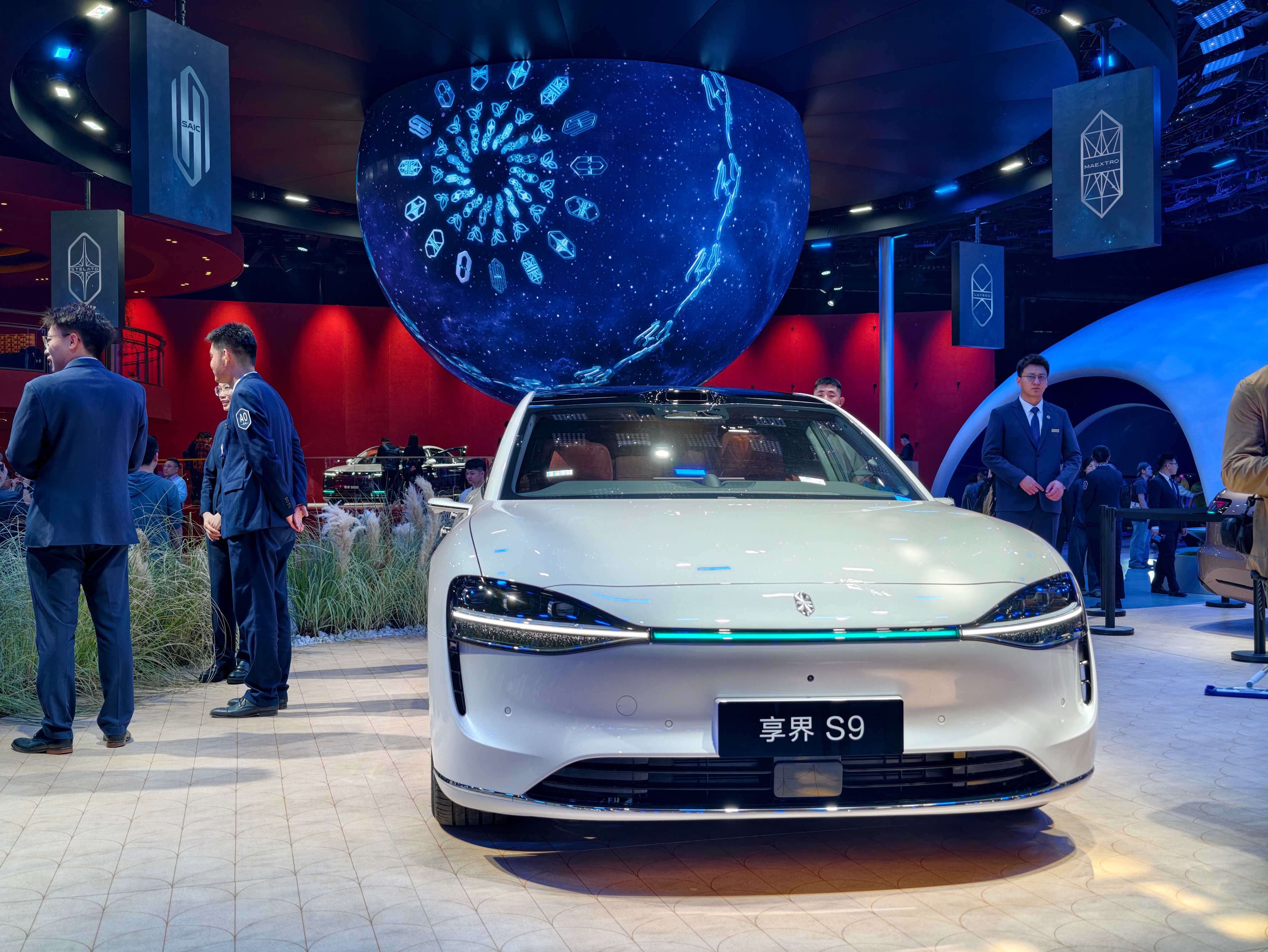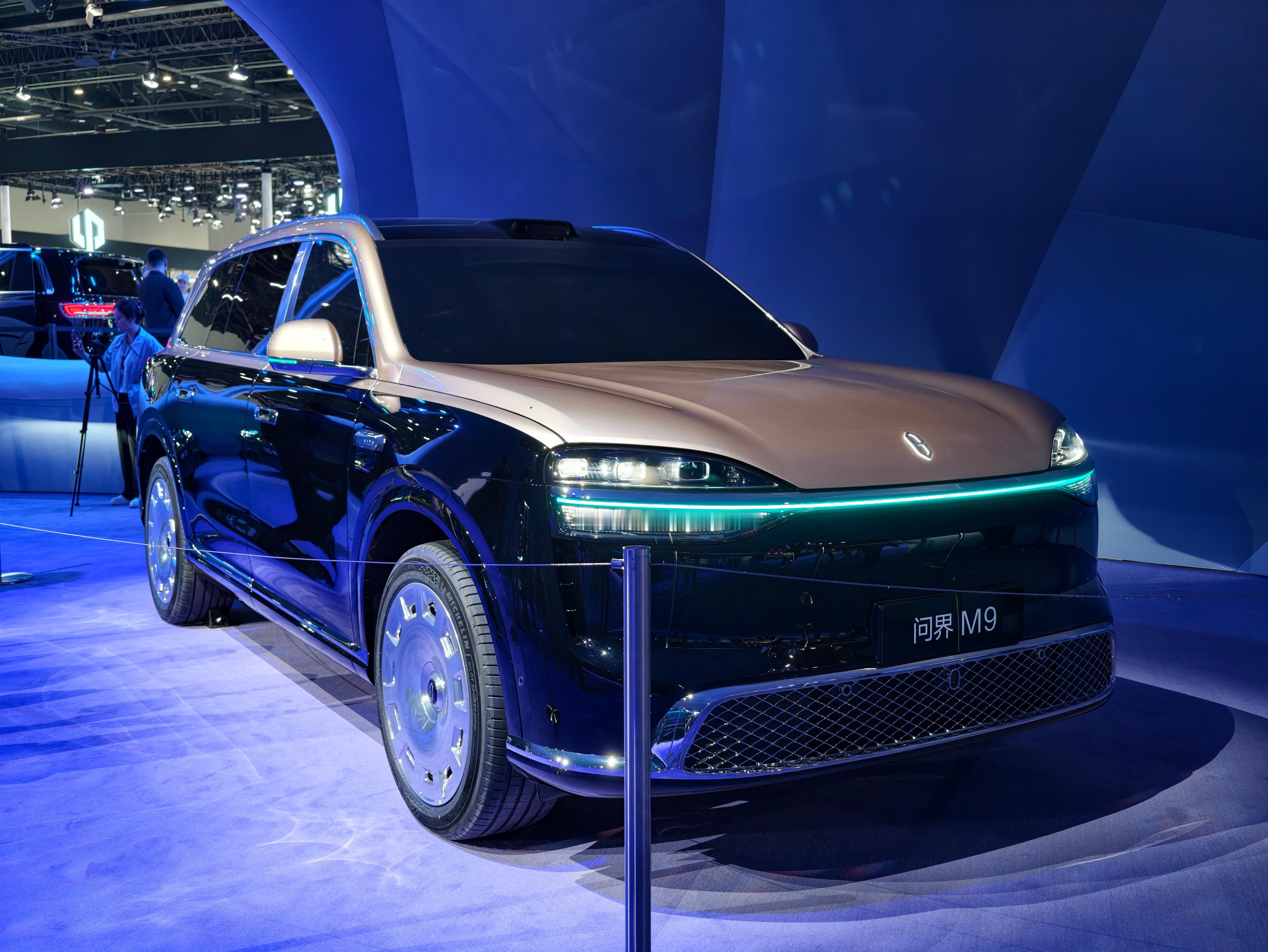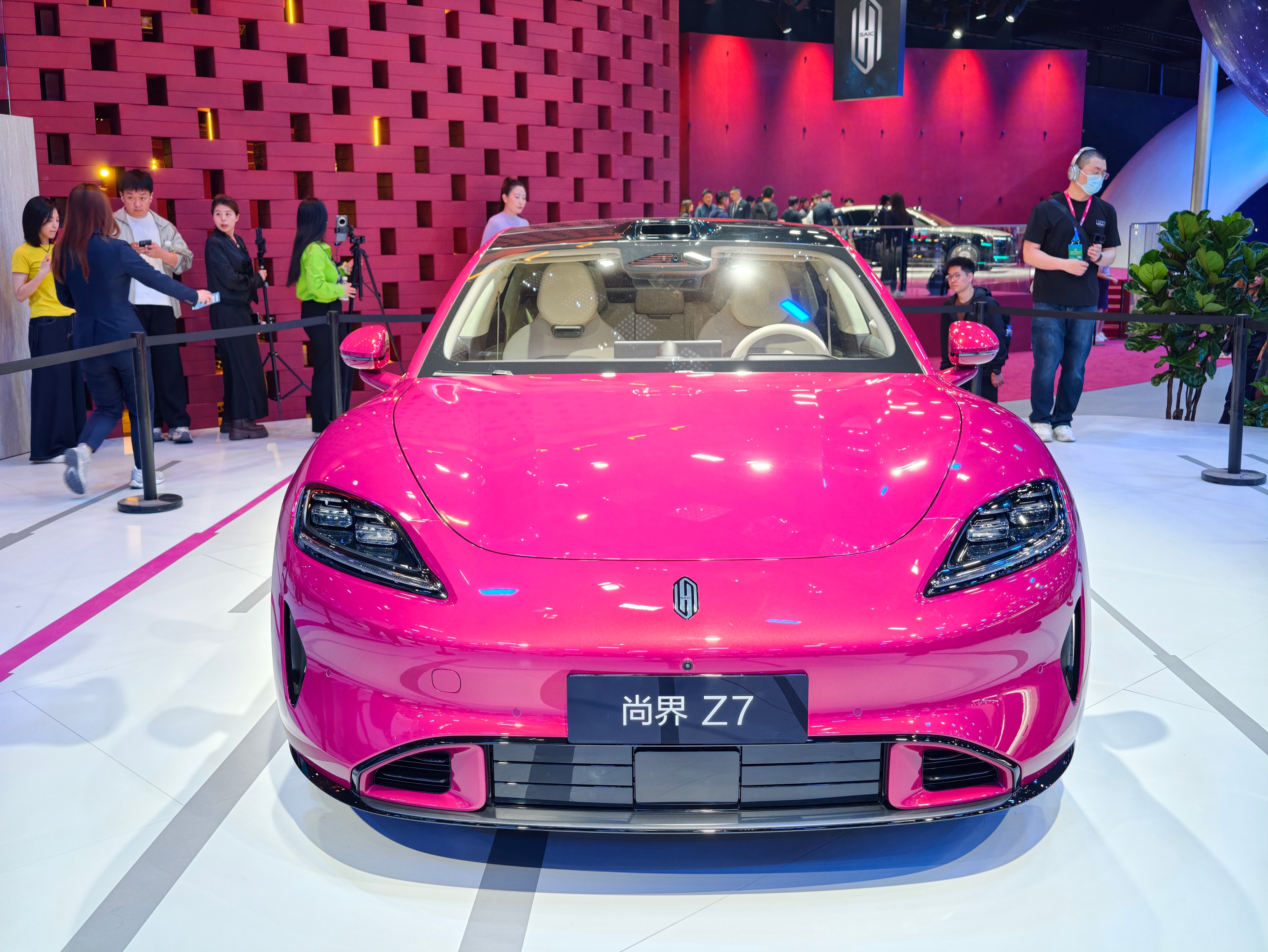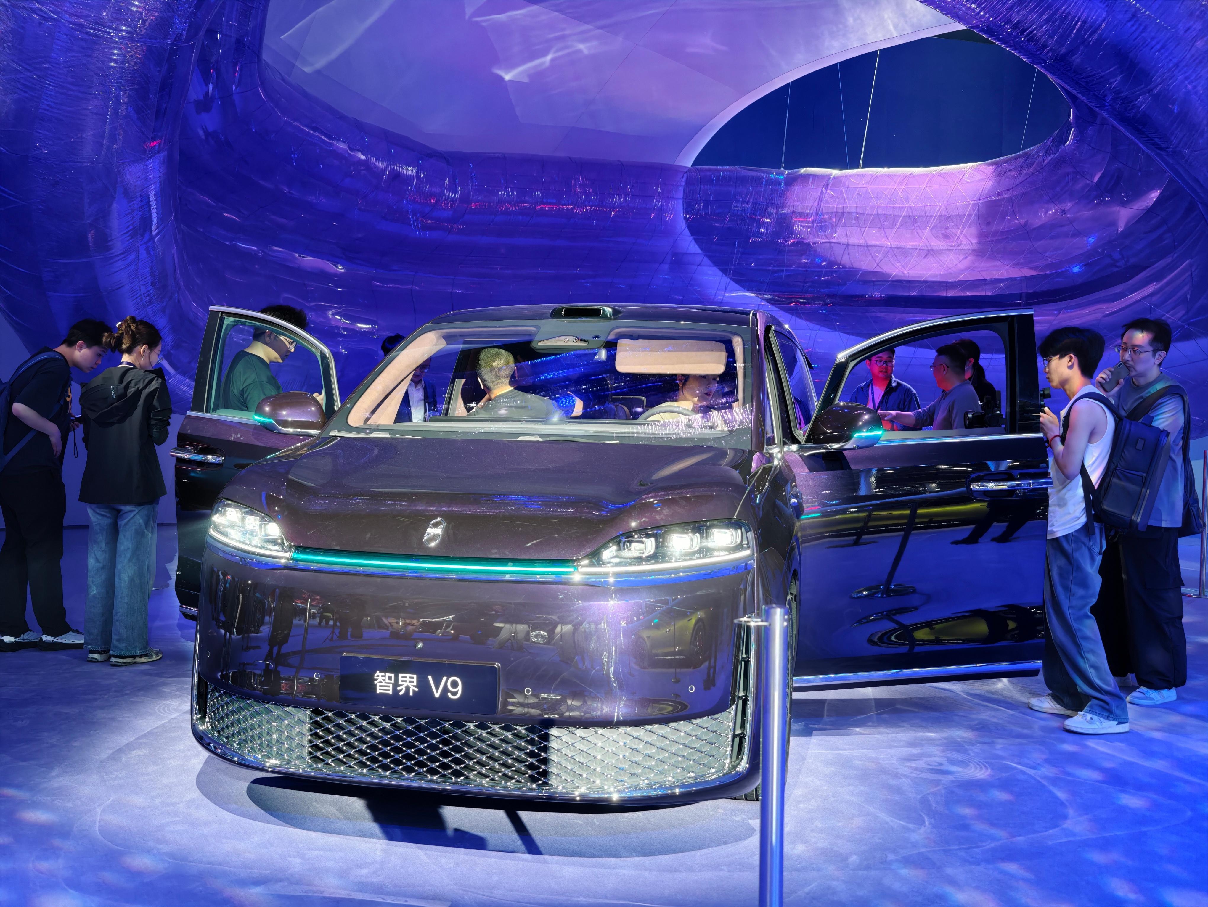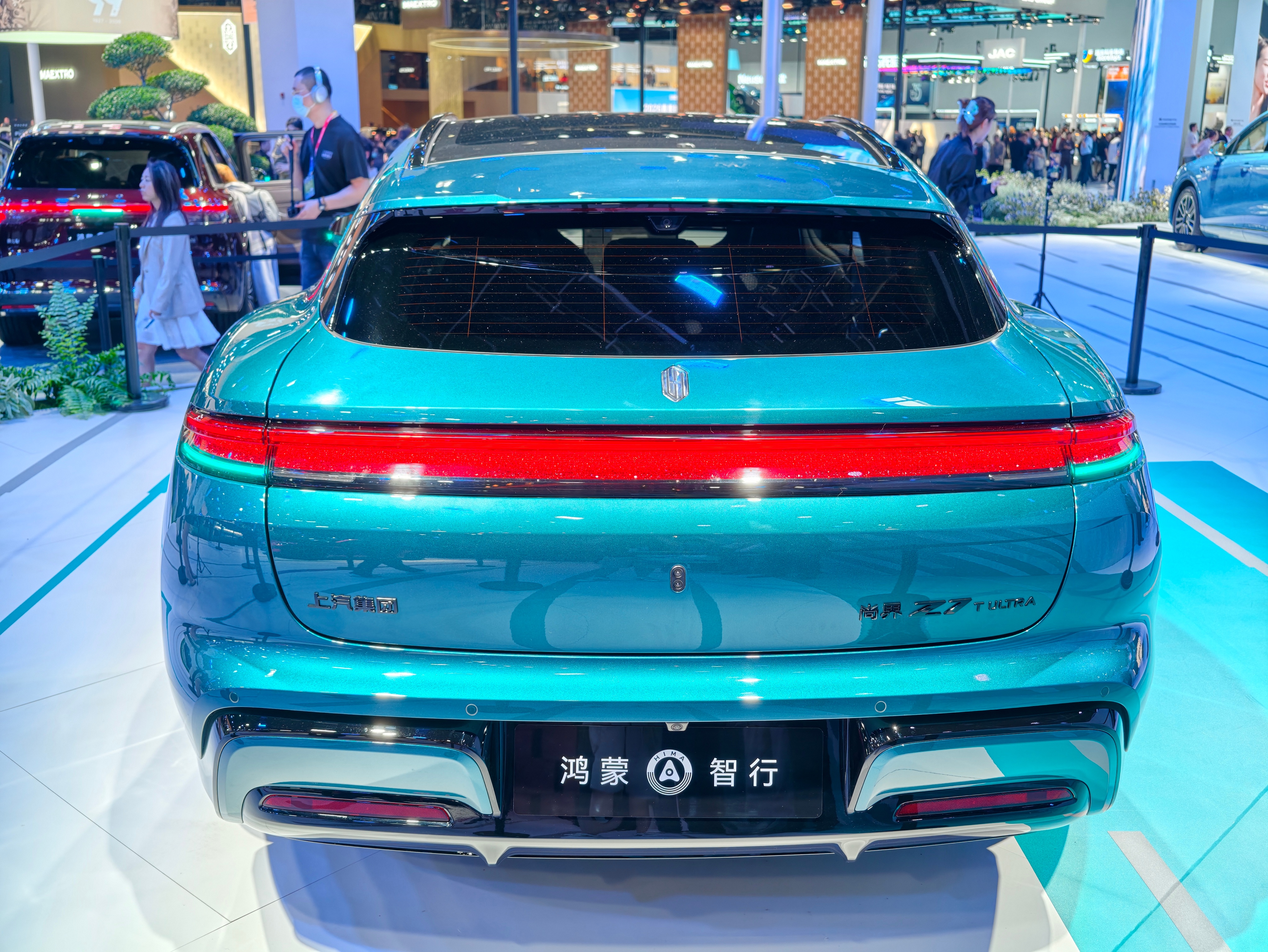 这次鸿蒙智行依旧是携旗下所有主机车型亮相,你可以看到还没有完全曝光的全新一代问界M9系列,智界V9,问界M6,享界S9等等一堆新车,而且全部是升级了896线的新款,讲真的一辆比一辆看着心动,但是要我说最靠惊艳的,还得是尚界Z7,尤其是流光大灯+贯穿碎钻尾灯+低趴宽体轿跑设计,颜值是真的高。