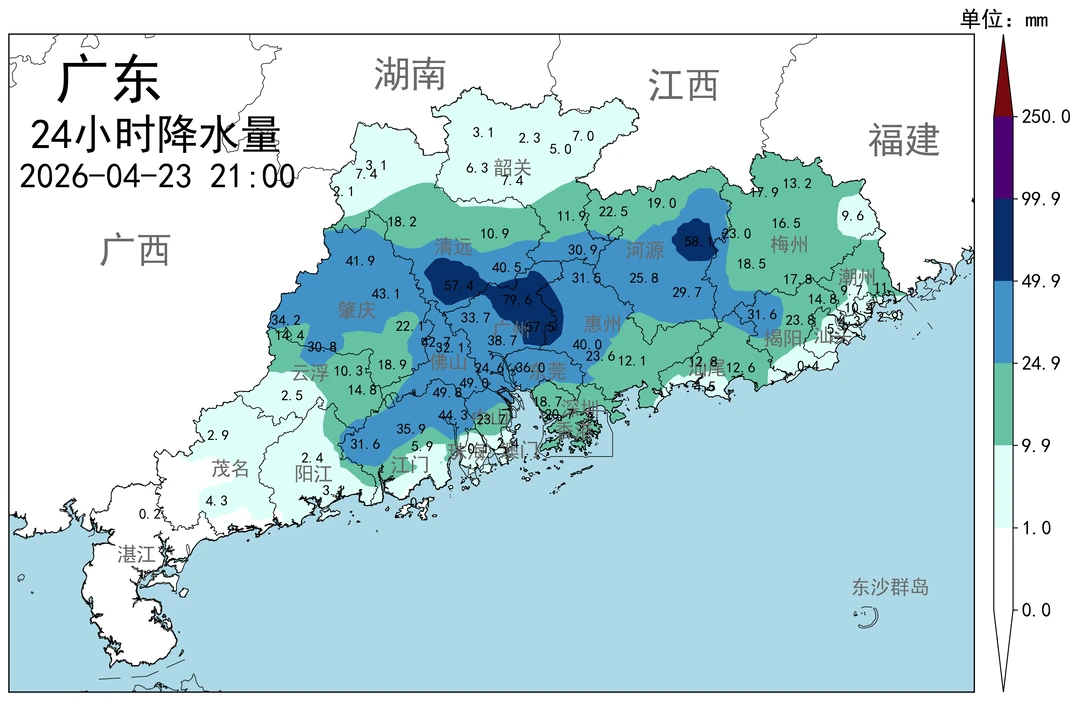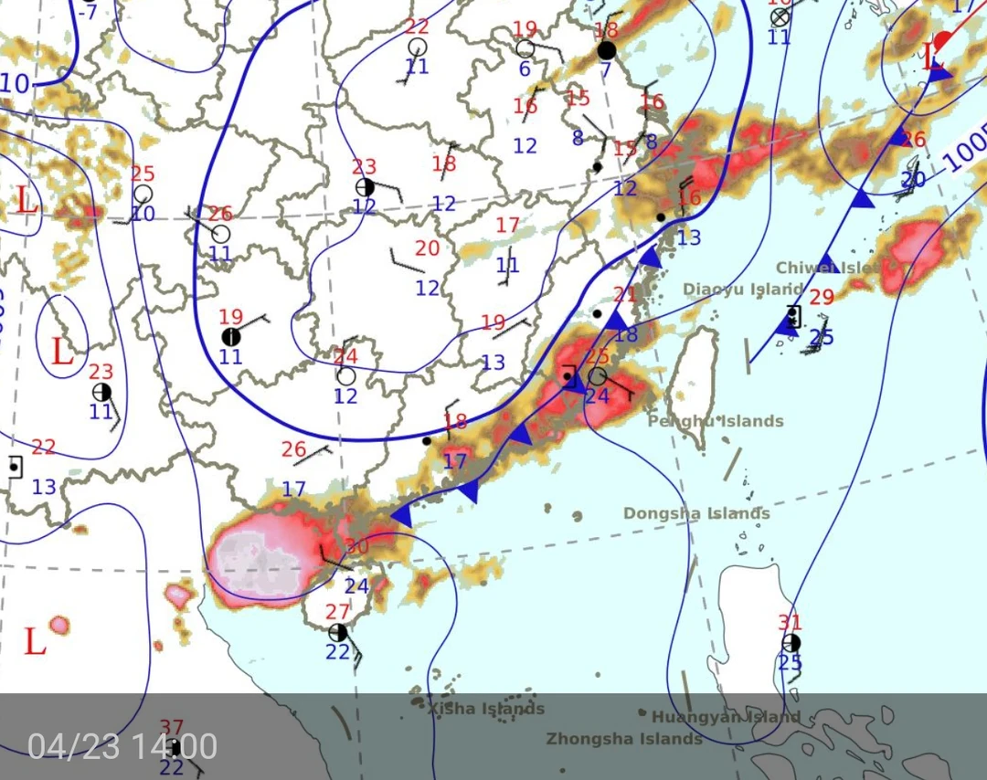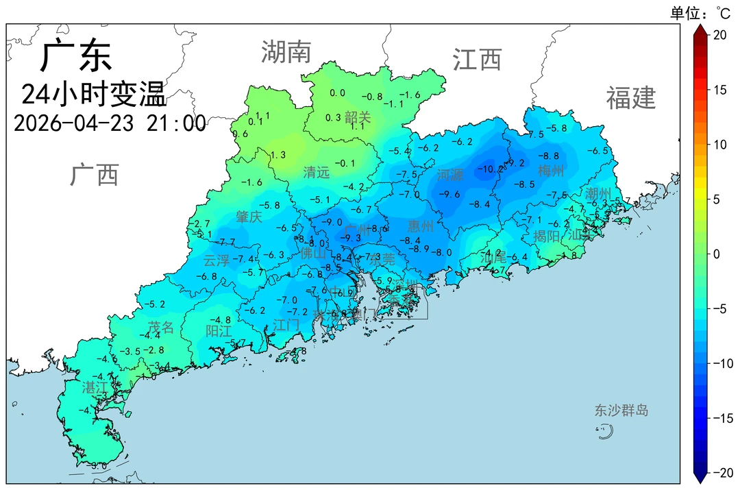 今天,4月23日(周四),受南下冷空气与暖湿气流影响,广东中南部地区(肇庆,广州,佛山,河源,深圳,惠州,东莞等地区普遍多大雨,局部暴雨)。⚠️气温也跟随出现6~8度降温,局部降温幅度达到10度,属于“小型倒春寒”。