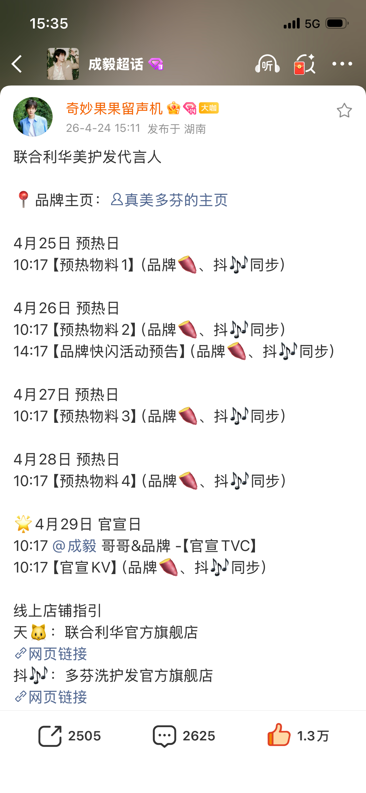 4月29日,成毅×联合利华美护发代言人官宣,顶级商务,一路生花🌸