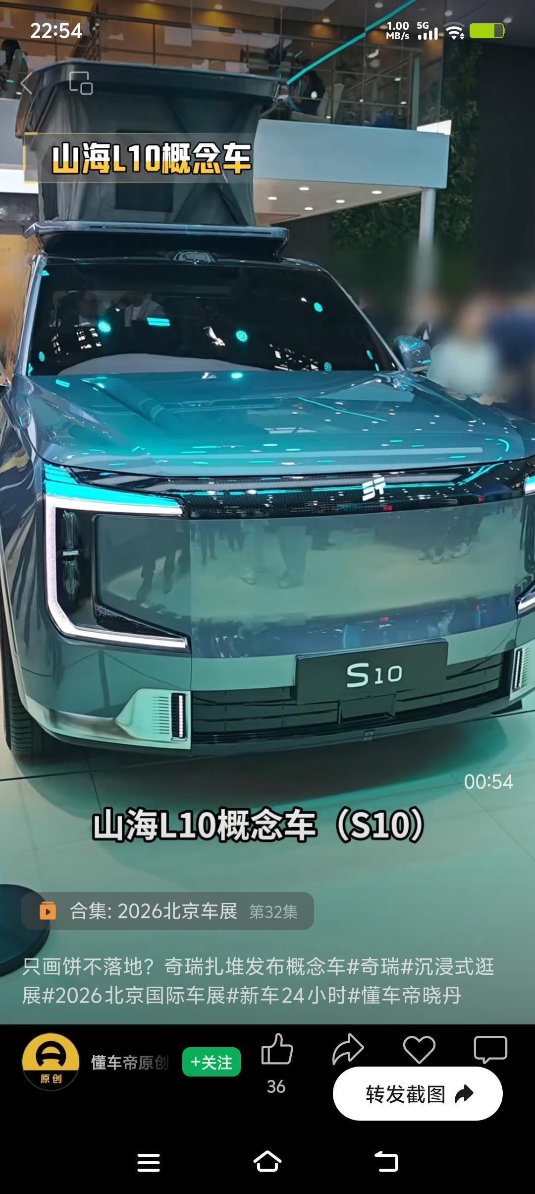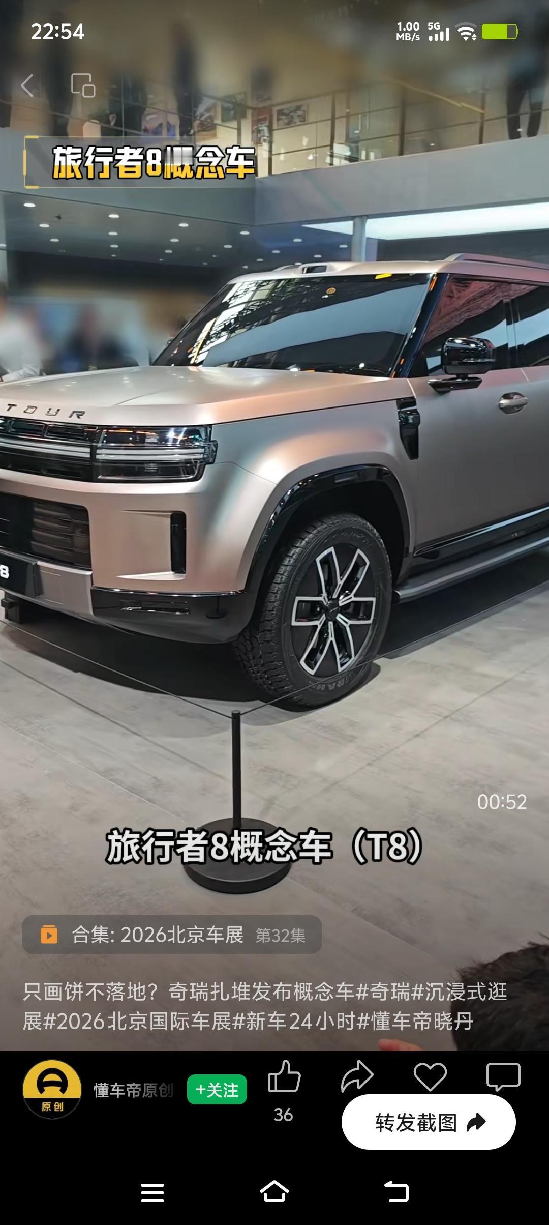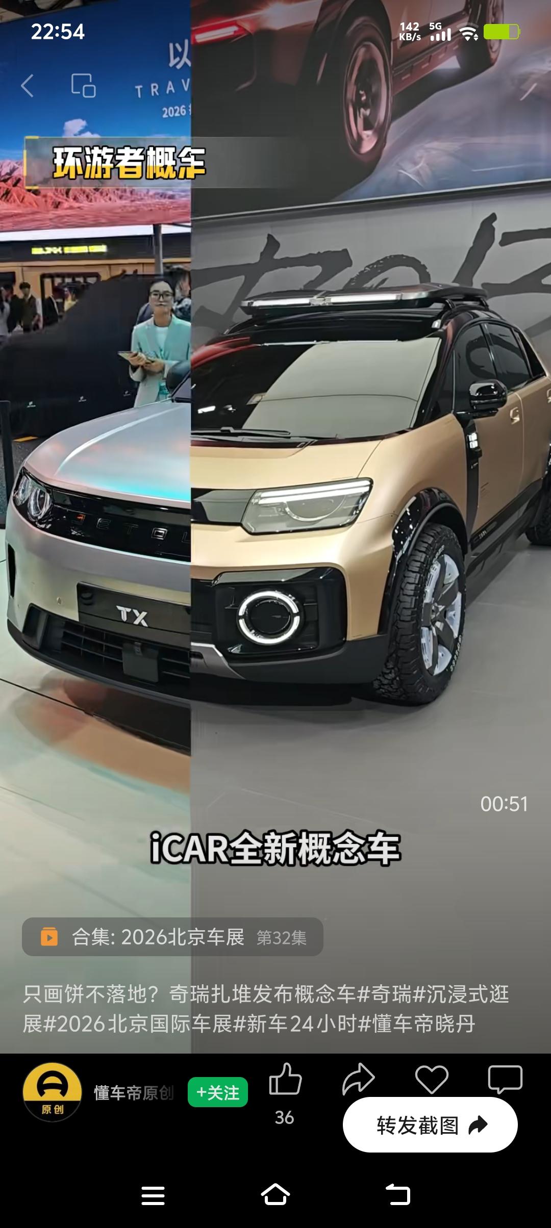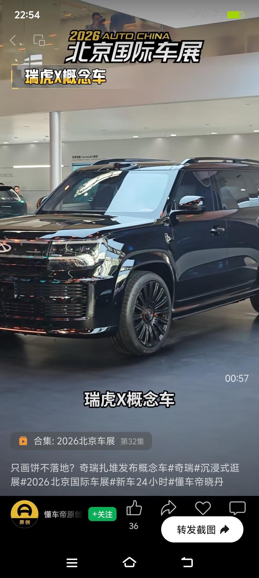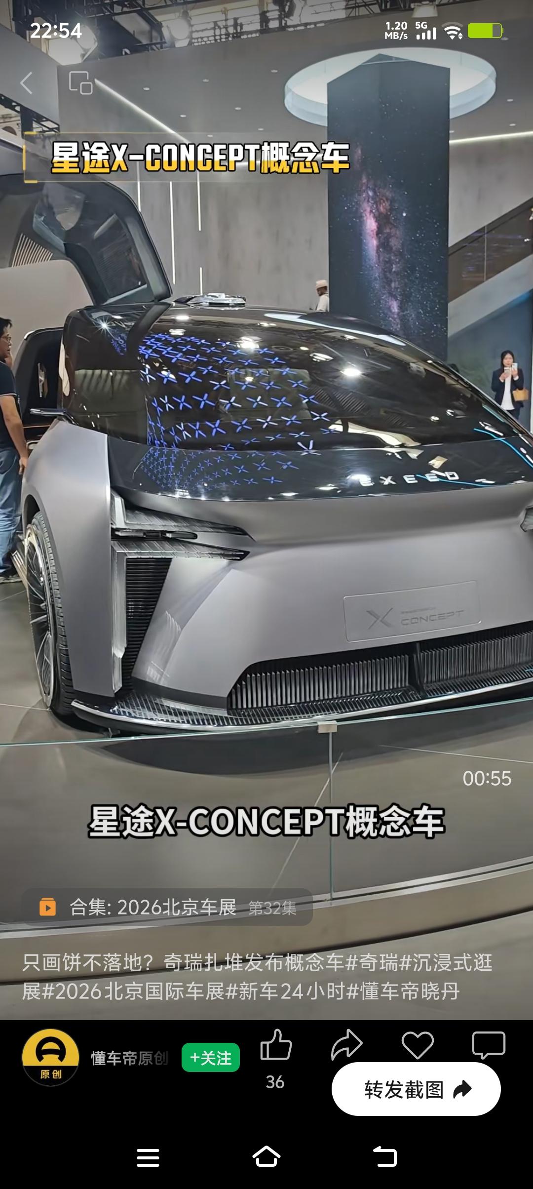 旗下各品牌也都有亮眼表现。星途的X - CONCEPT概念车,一体流线造型和贯穿式灯组科技感十足;EX VISION行政定位车型,对开门、天地尾门等设计超奢华。奇瑞品牌携瑞虎X等概念车,展现先锋设计;捷途围绕“旅行 +”发新车;纵横凭硬派越野矩阵宣告新坐标;iCAR把概念车和新能源摩托车一起展示。这不仅是车型罗列,更像是一场创新盛宴,看得出奇瑞的野心和实力,未来值得期待! 声明:(借用网络视频)