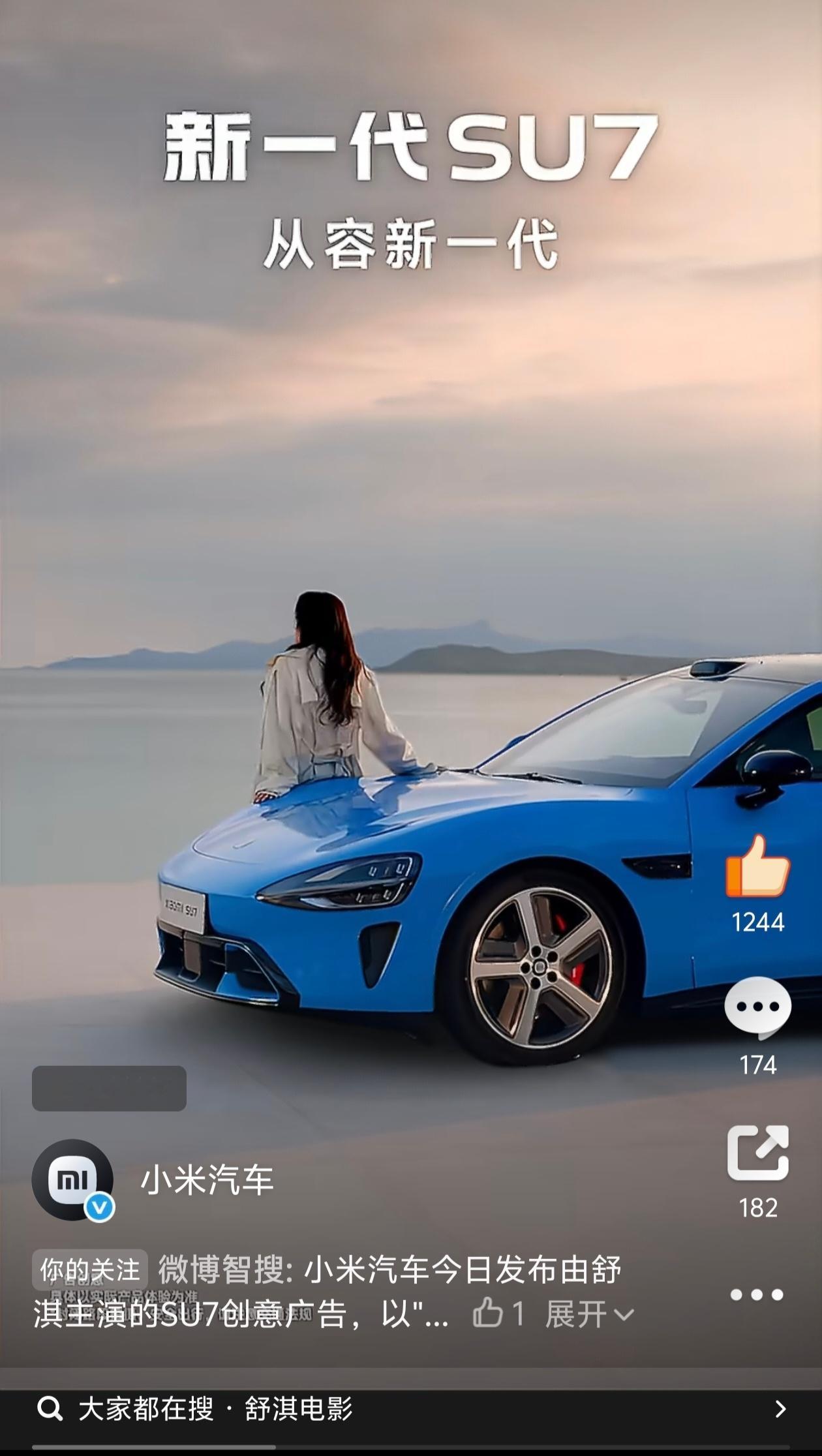 舒淇拍SU7舒淇不仅代言新一代小米SU7,还当导演给SU7拍广告片。