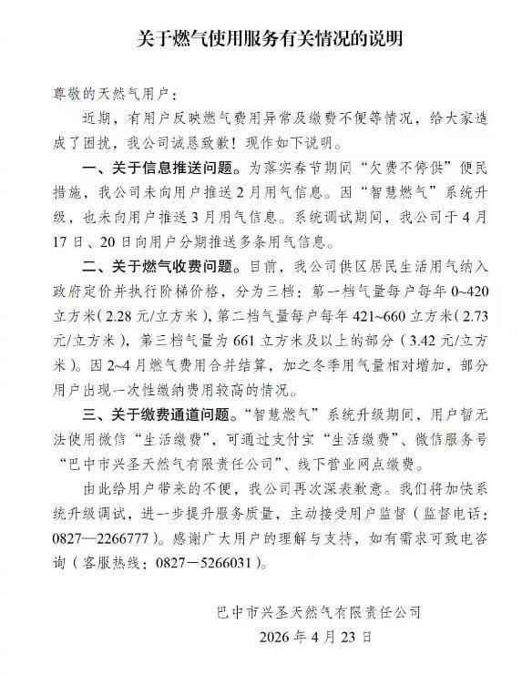 对此,巴中市兴圣天然气有限责任公司于4月23日回复一位市民称,经核实,该公司供区居民生活用气纳入政府定价并执行阶梯价格,分为三档:第一档气量每户每年0~420立方米(2.28元/立方米),第二档气量每户每年421~660立方米(2.73元/立方米),第三档气量为661立方米及以上的部分(3.42元/立方米)。因2~4月燃气费用合并结算,加之冬季用气量相对增加,部分用户出现一次性缴纳费用较高的情况。