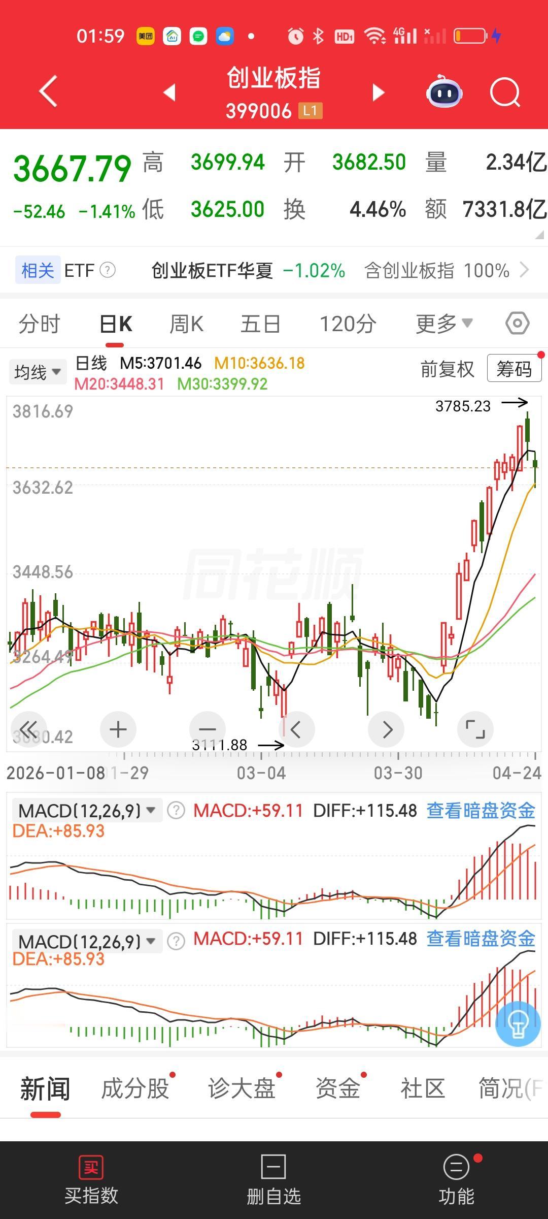 下周一创业板指看修复。周五杀的是创业板涨的是科创板,刚好创业板跌了1.41%,科创板涨了1.47%。那么下周一率先反弹的也会是创业板。但我们都知道创业板指和现在最火的光是深度捆绑的,看创业板反弹修复也就等同于看光会修复。但反弹以后别追,该减仓自救还是得自救。要把风险控制到最低。