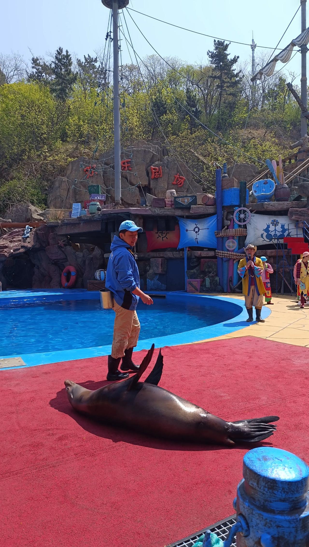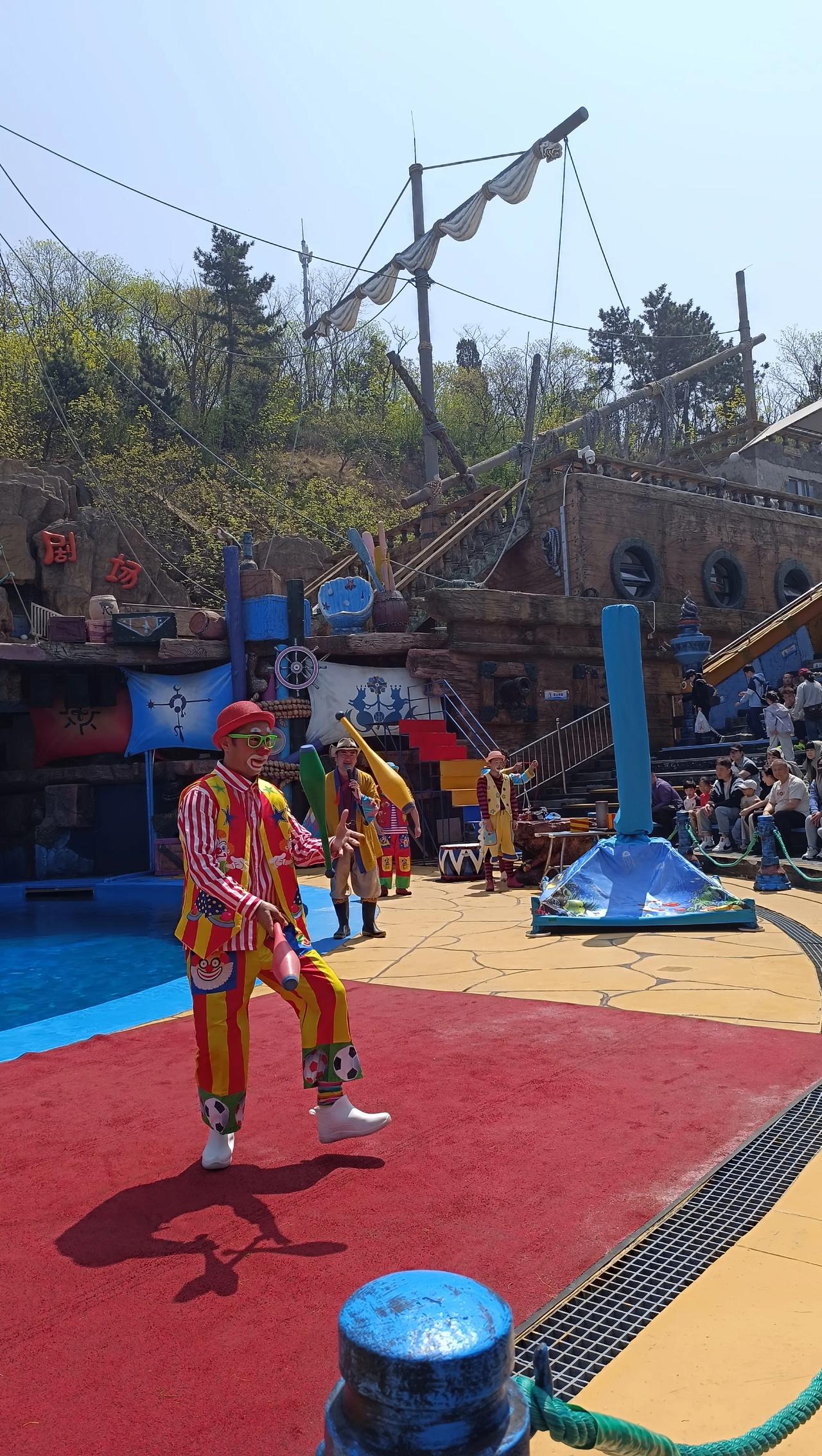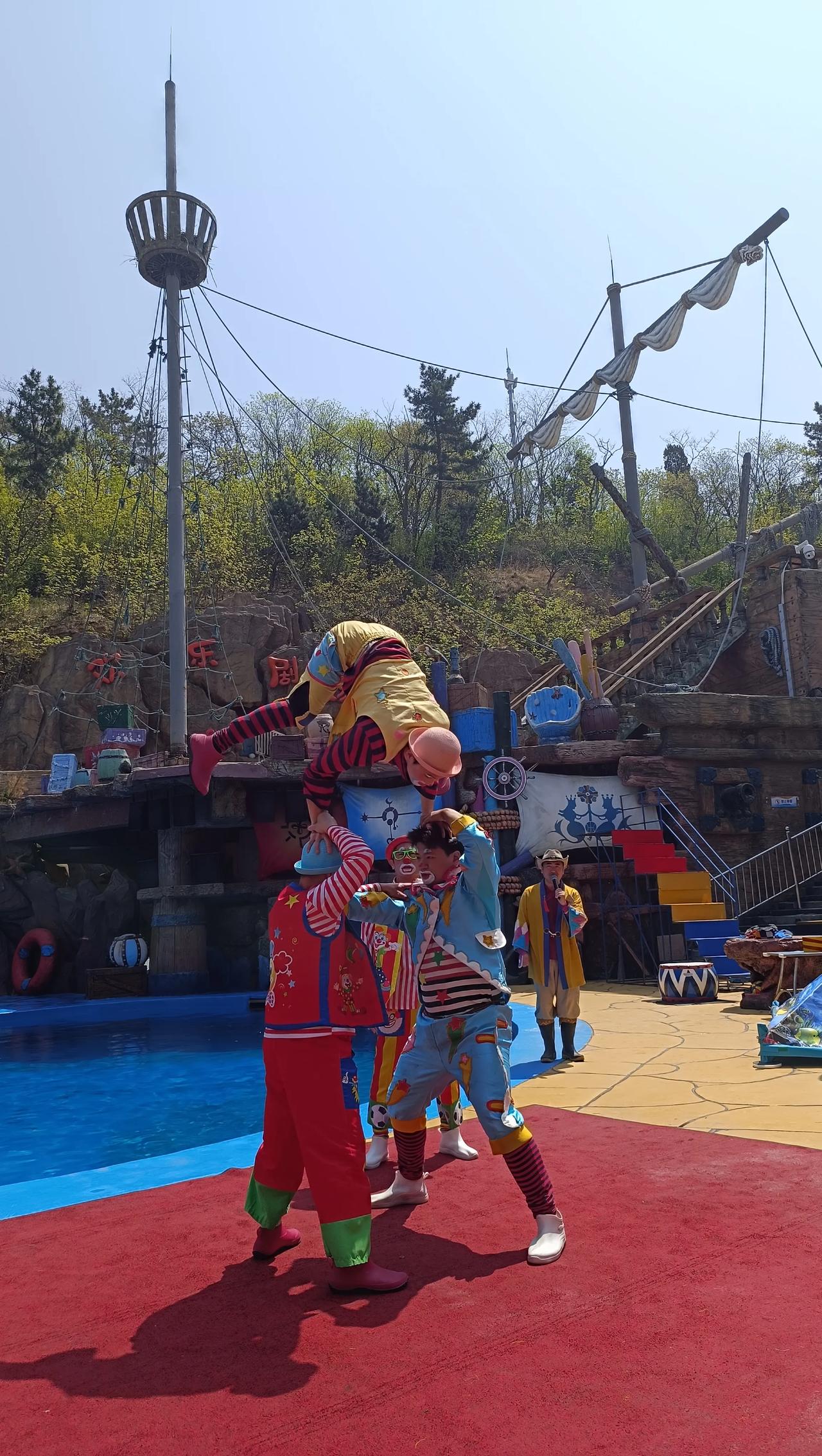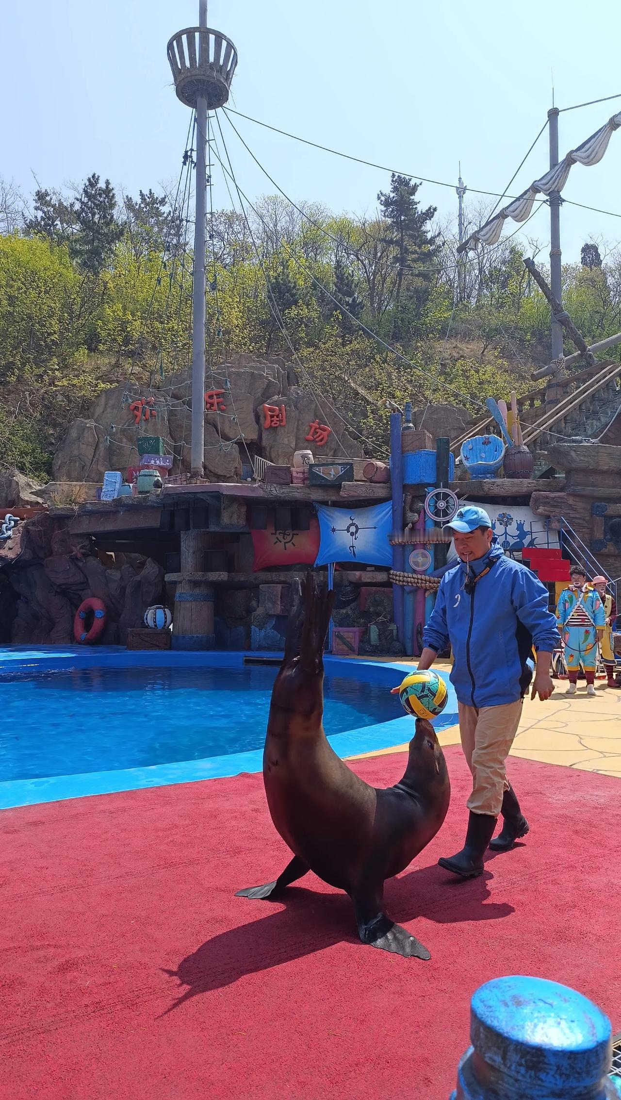 进了公园看了眼表演时间,刚好约1小时后有一场欢乐剧场的表演,我们直奔排队口附近,找个树荫踢毽子。就在极地馆外侧,能听到极地馆内表演的声音,也因为特别熟悉流程,我们知道里面演到哪了[偷笑]那边表演散场后,会有一大众游客到欢乐剧场排队,我们盯着他们来的方向,有几波人了,我俩赶快去排队[呲牙]近水楼台!所以坐的位置也正[6]