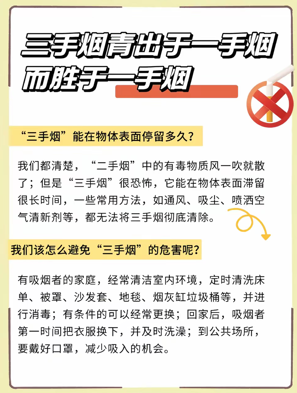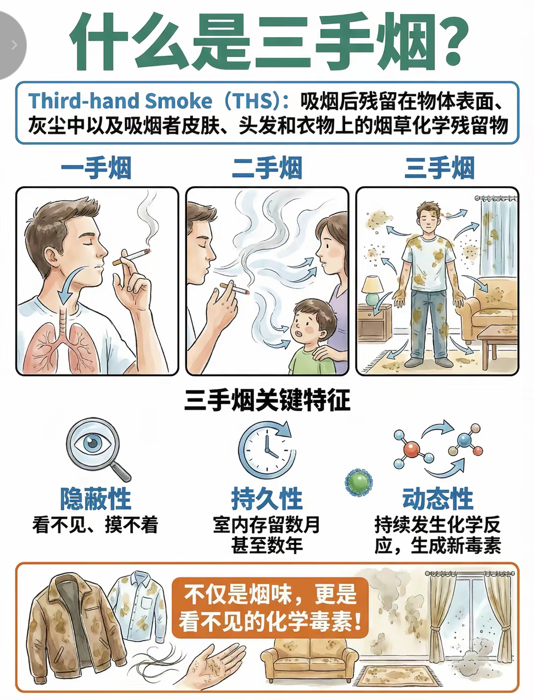 三手烟三手烟的危害比吸烟还大?!!“三手烟”,是指抽烟后在衣服、头发等表面产生的烟草残留物,有着极强的隐蔽性,让人不知不觉中招;留存时间长达数月甚至数年,普通通风、吸尘、喷空气清新剂根本无法彻底清除;更可怕的是,它还会在环境中持续发生化学反应,不断生成全新的强致癌物,可谓“青出于蓝而胜于蓝”!路上遇到的游烟有多毒