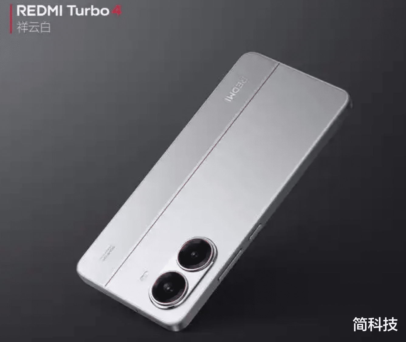目前小米官方公布了 REDMI Turbo 4 的外观照,根据图片来看,新机后盖采用拼色设计,背面左上角为竖排双摄模组,手机背面有一条红色腰线贯穿磨砂柔雾玻璃后盖。该机共有 4 款配色,海报中的为「祥云白」。
