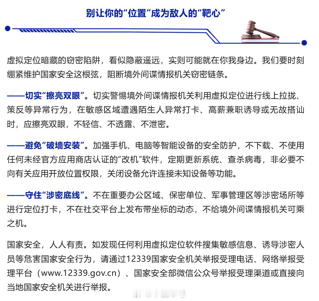 国家安全,人人有责。如发现任何利用虚拟定位软件搜集敏感信息、诱导涉密人员等危害国家安全行为,请通过12339国家安全机关举报受理电话、网络举报受理平台(www.12339.gov.cn)、国家安全部微信公众号举报受理渠道或直接向当地国家安全机关进行举报。(国家安全部)