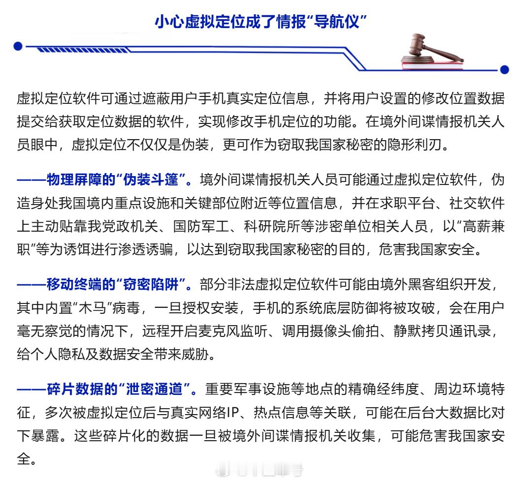 小心部分虚拟定位软件含木马病毒【国安部披露间谍用虚拟定位软件窃密】明明身在办公室,朋友圈定位却在马尔代夫?明明足不出户,游戏账号却在异地“打卡”领取礼包?当前,虚拟定位软件正成为不少人的“社交神器”。然而,这类看似“便捷”的工具,可能被境外间谍情报机关利用,演变为一种“非接触式”窃密方式,危害国家安全。