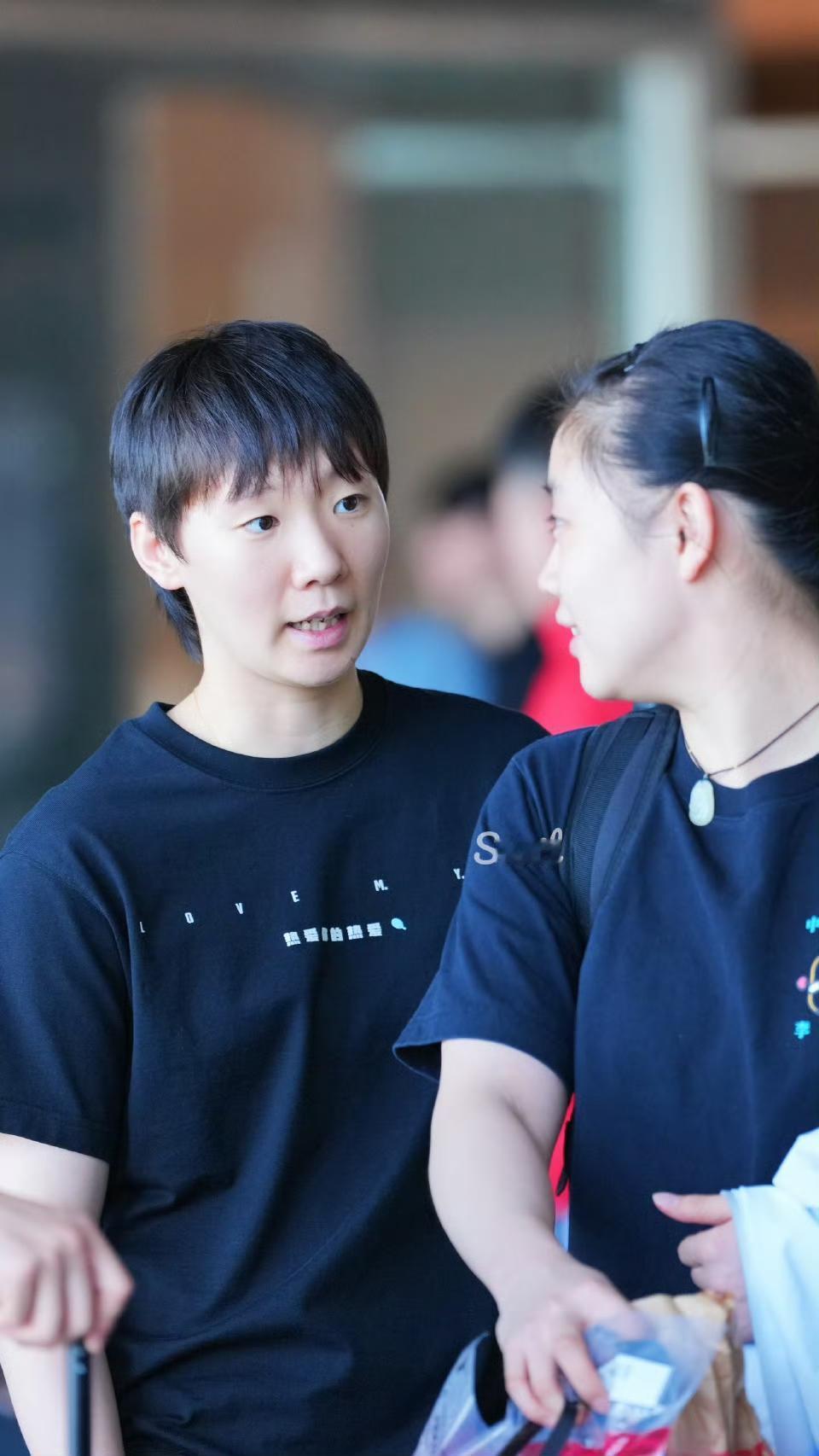 国乒选手们在出征仪式上都是穿着上红下黑的新队服,仪式结束后正式出发赶路,曼昱换上了一件雅白底色,中间点缀黑红几何图案的上衣外套,高挑的身材,白皙的肤色,甚是好看。