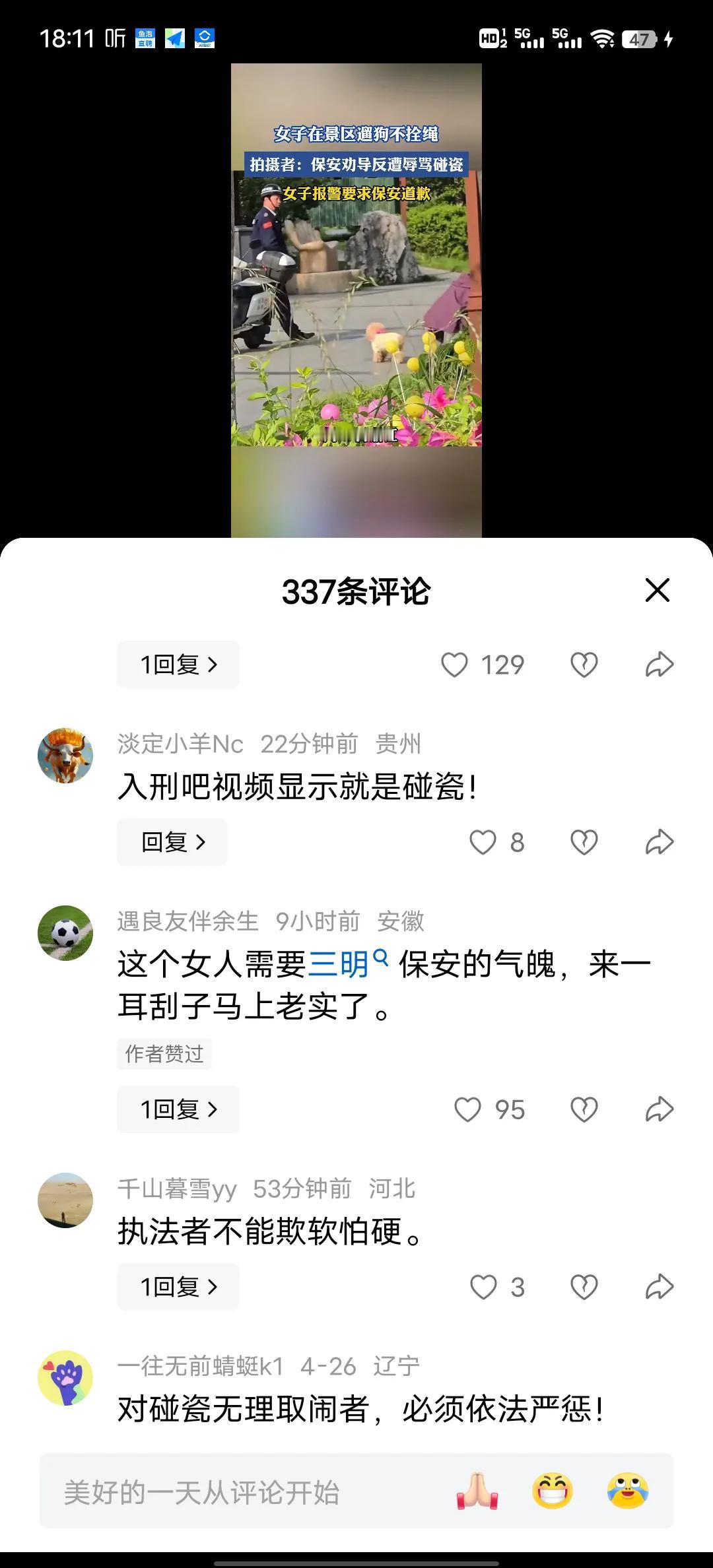 一景区的公园保安劝阻女子遛狗要拴绳子,可是女子直接耍无赖,女子直接自己倒下,此女子真是人才,这个保安大爷有点太仁慈了,应该让三明的保安来处理她。