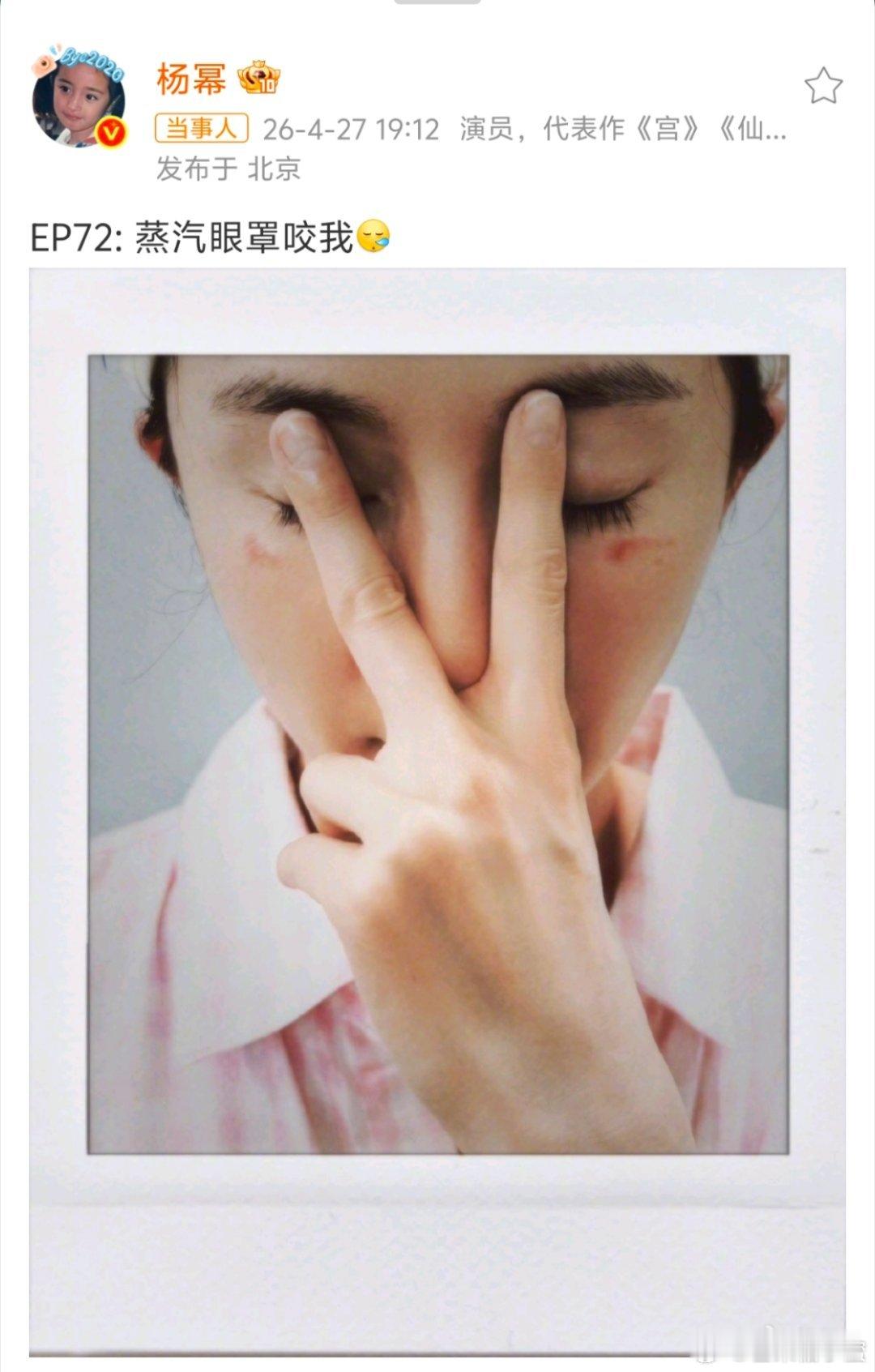 杨幂脸被蒸汽眼罩烫伤了杨幂居然被蒸汽眼罩“咬”了!发博晒出眼下的烫伤红印,语气也