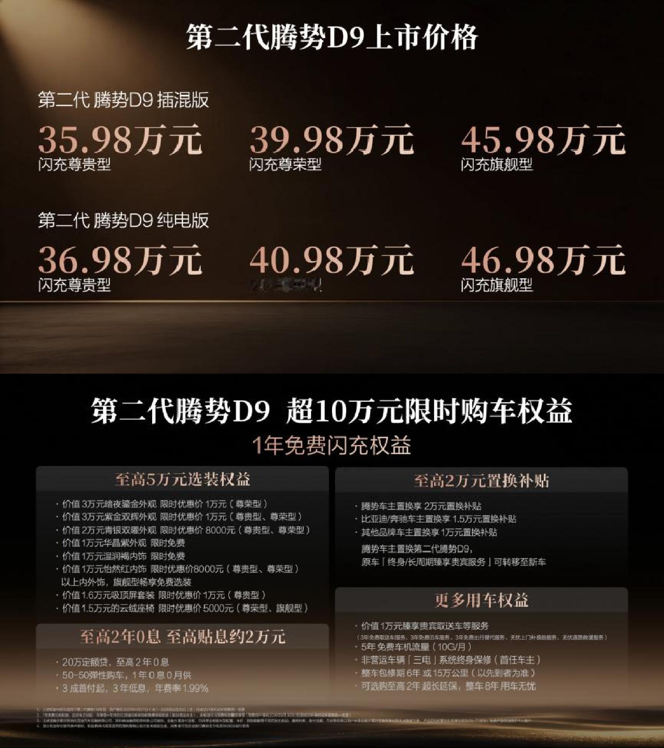 4月27日,第二代腾势D9正式上市,推出3款插混版、3款纯电版车型,官方指导价35.98万-46.98万元,新车实现九大维度全面迭代,搭载多项行业前瞻科技,重塑豪华出行的新追求,让商务人士无需在充电续航上耗费精力,把碎片化时间转化为高效工作与商务洽谈的契机,完成时间成本到财富价值的无形转化。满谈科技满谈科技