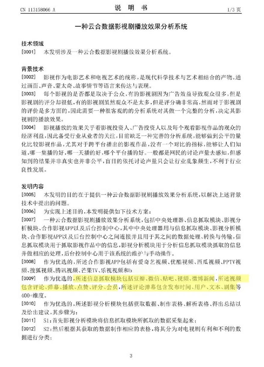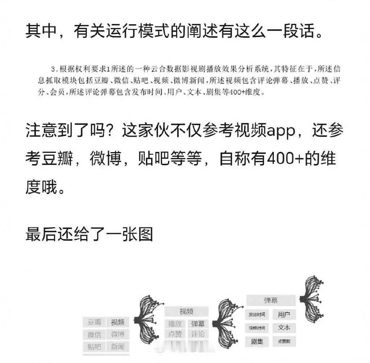有网友扒了云合在21年过申请过热度专利,这个专利说他们的热度是模拟各平台的热度值,而不是有各平台的借口,另外还抓取了类似豆瓣、微信、贴吧等平台的营销数值。