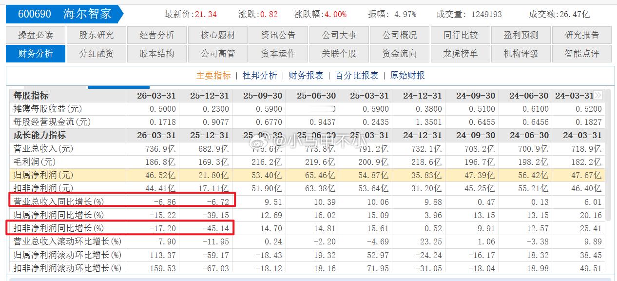家电行业,海尔一季度扣非利润减少17%