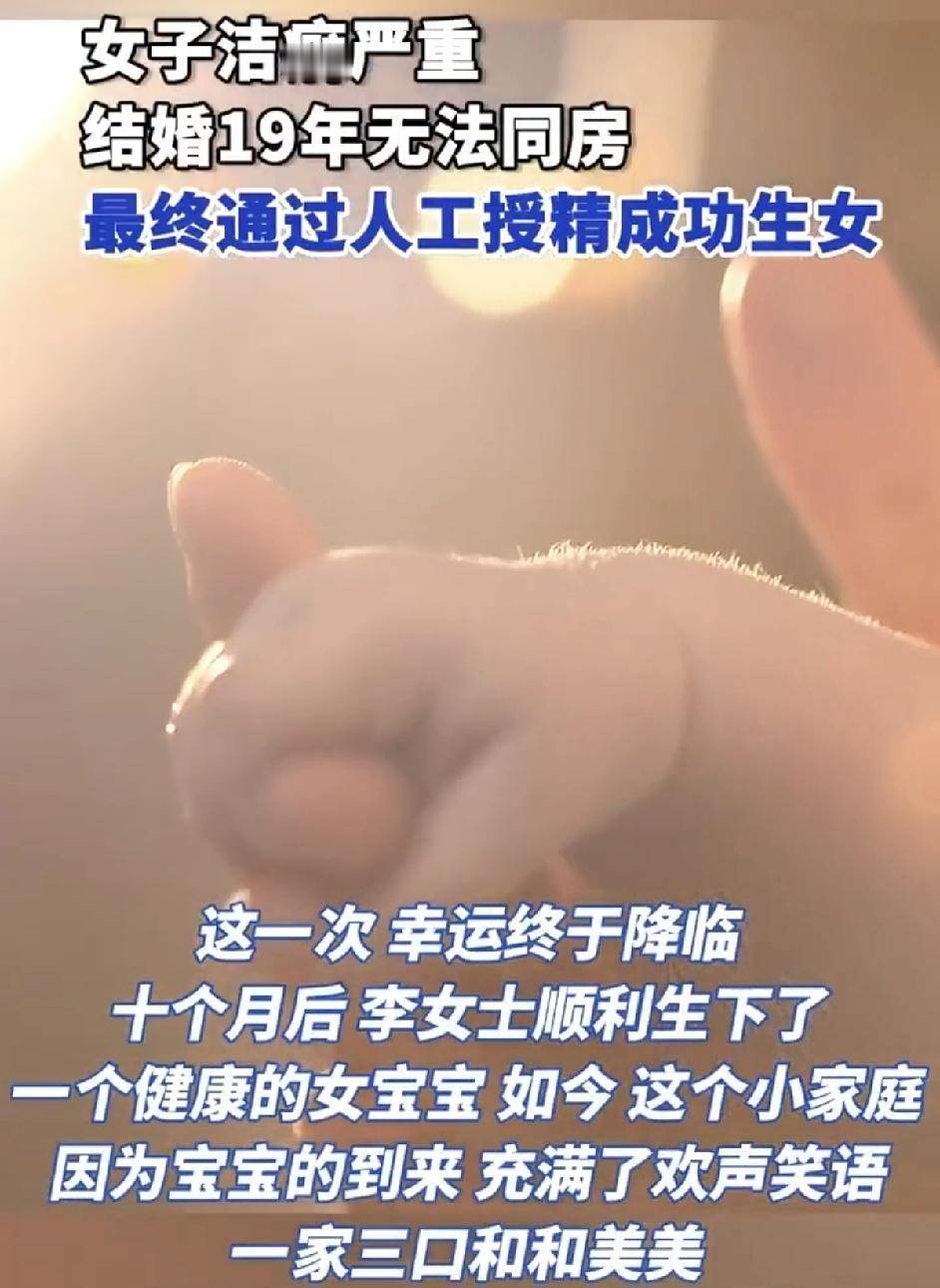 浙江杭州,一对结婚十九年的夫妻,因为老婆患有严重的洁癖症,夫妻从来没有亲密关系过,所以也没有孩子,如今看着周围同龄人的孩子都已经上初中了,心里无限遗憾,为了弥补这个遗憾,夫妻共同决定用人工受孕的方式生一个属于自己的孩子,第一次失败了,却在第二次成功了,生了一个可爱的小公主,对于他们来说,也是人生小圆满吧!