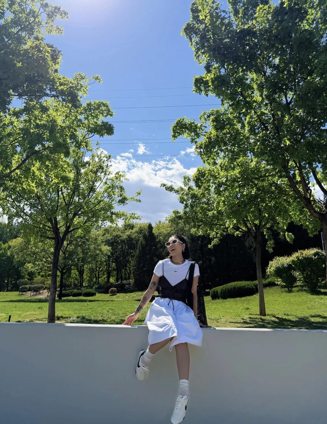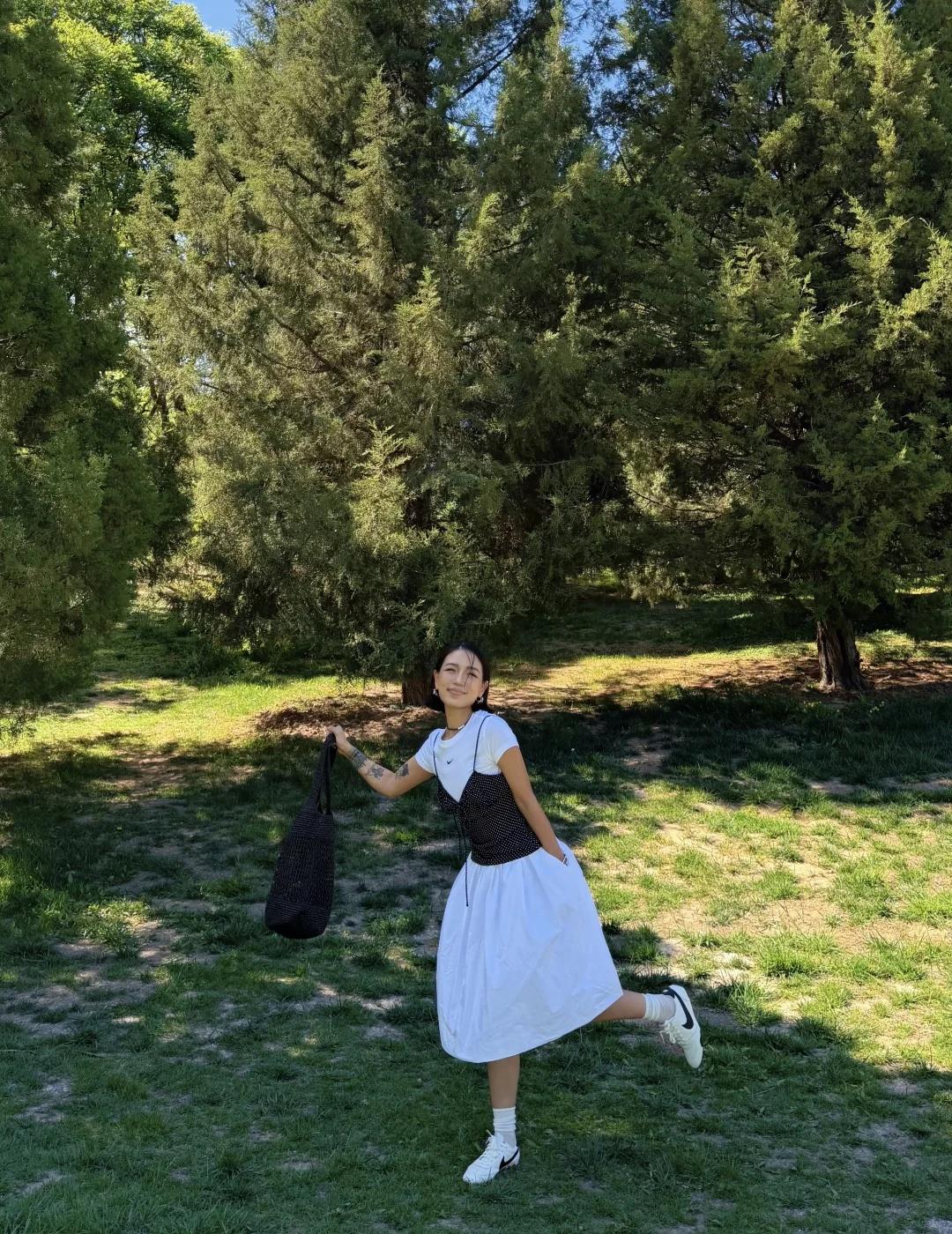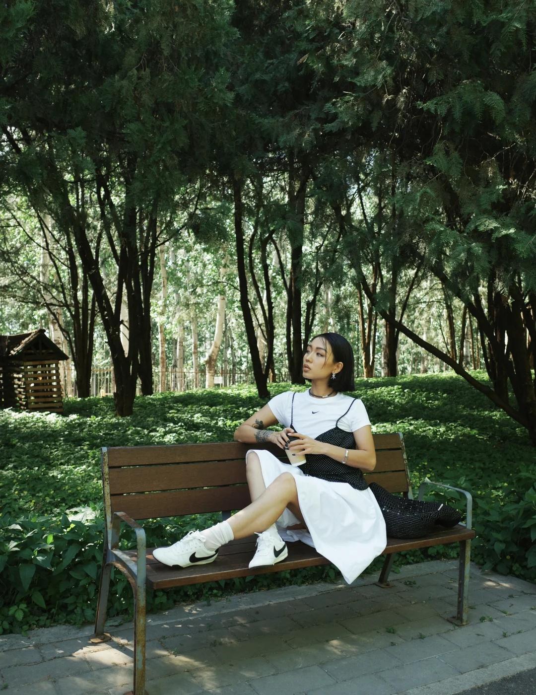 白T、白裙、黑色马甲叠穿出层次,