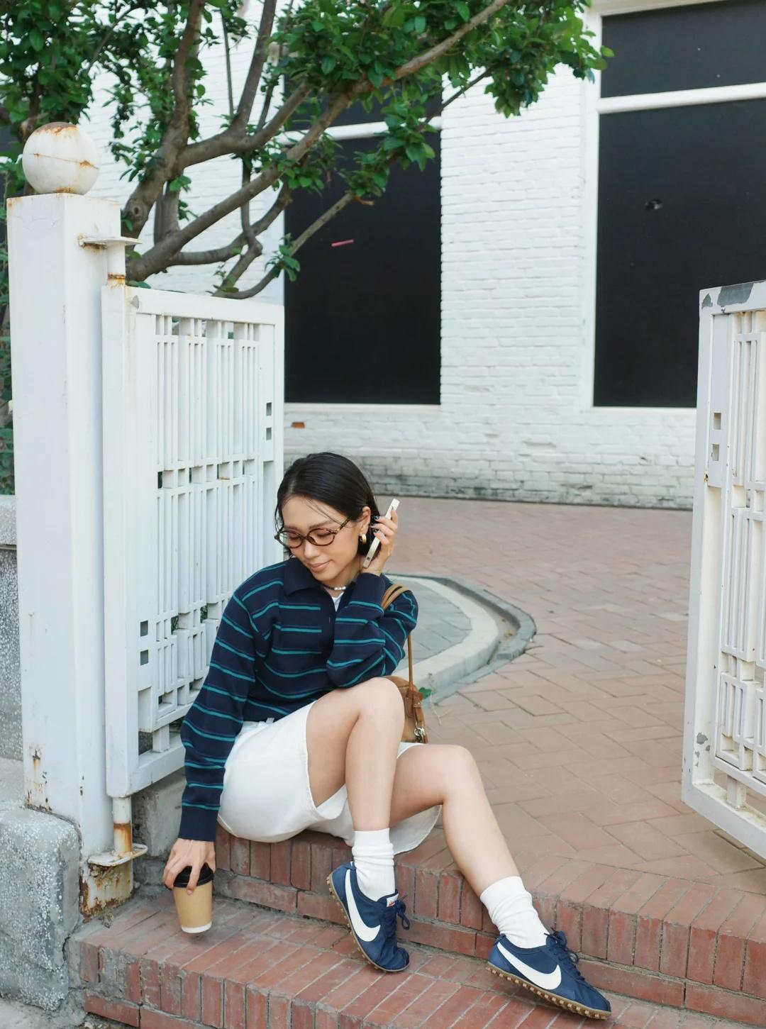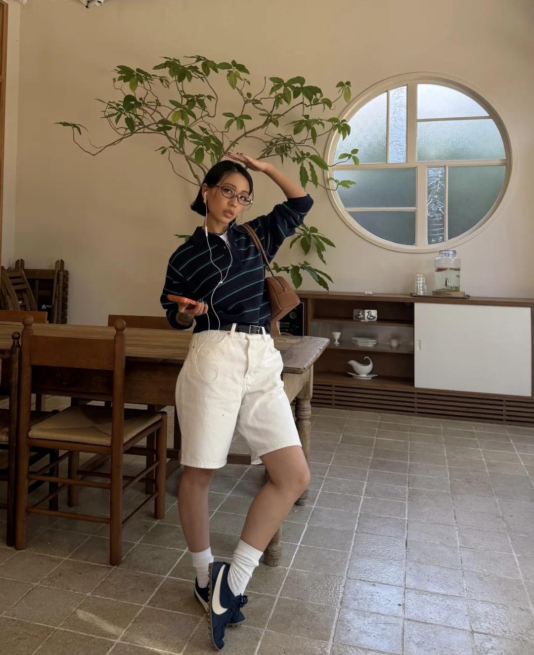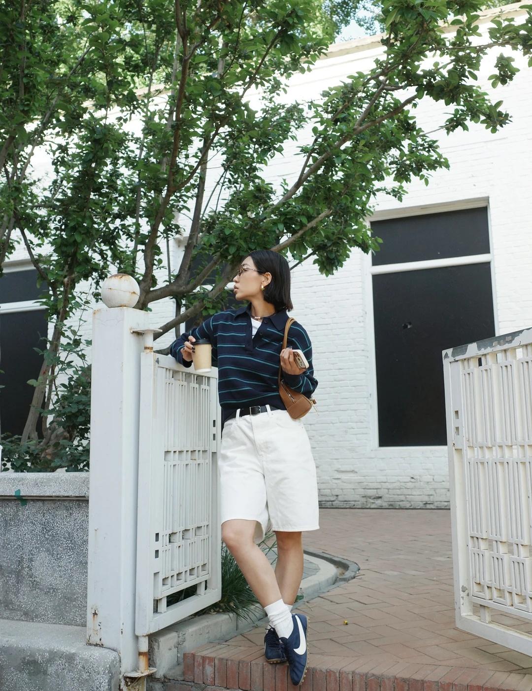 条纹polo、白色中裤、长袜