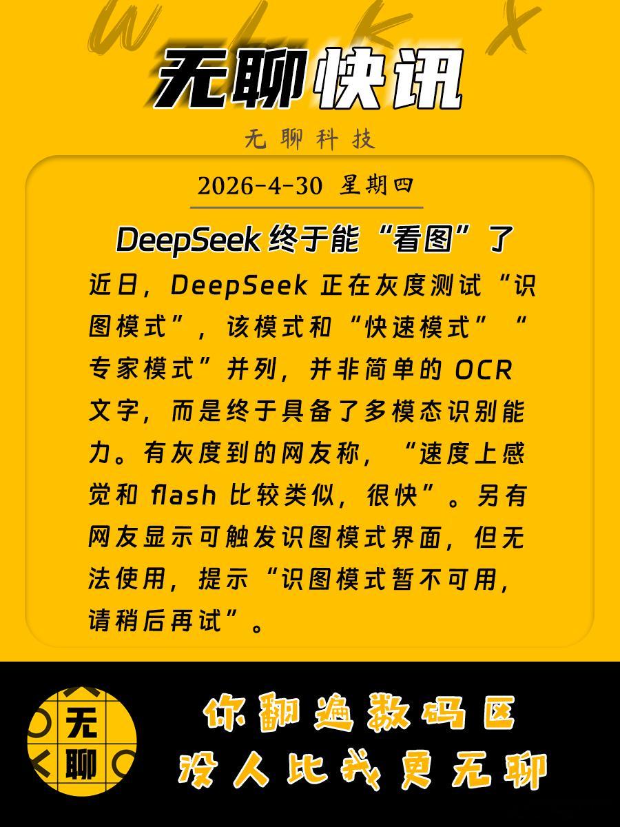 【DeepSeek 终于能“看图”了】近日,DeepSeek 正在灰度测试“识图模式”,该模式和“快速模式”“专家模式”并列,并非简单的 OCR 文字,而是终于具备了多模态识别能力。有灰度到的网友称,“速度上感觉和 flash 比较类似,很快”。另有网友显示可触发识图模式界面,但无法使用,提示“识图模式暂不可用,请稍后再试”。deepseek灰度测试识图模式有点东西