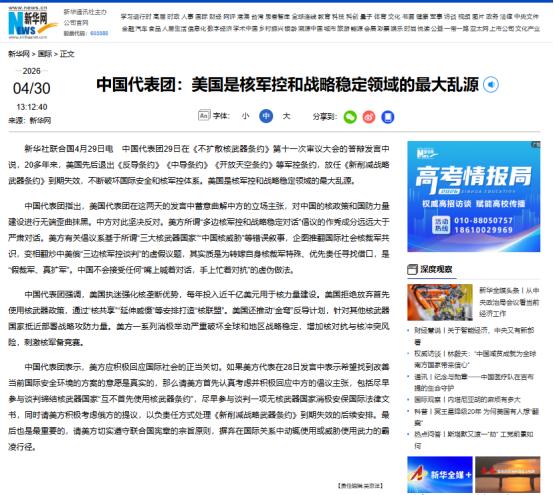 2026年4月29日,在纽约联合国总部举行的《不扩散核武器条约》第十一次审议大会上,美方代表在会场兜售所谓“多边核军控和战略稳定对话”倡议,摆出一副热爱和平的姿态。