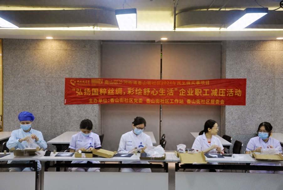 在香山街社区民生微实事项目“弘扬国粹丝绸,彩绘舒心生活”企业职工减压活动盛大开启。此次活动旨在通过弘扬丝绸文化以及各种非遗手工体验,为企业职工们提供一个独特的解压途径。