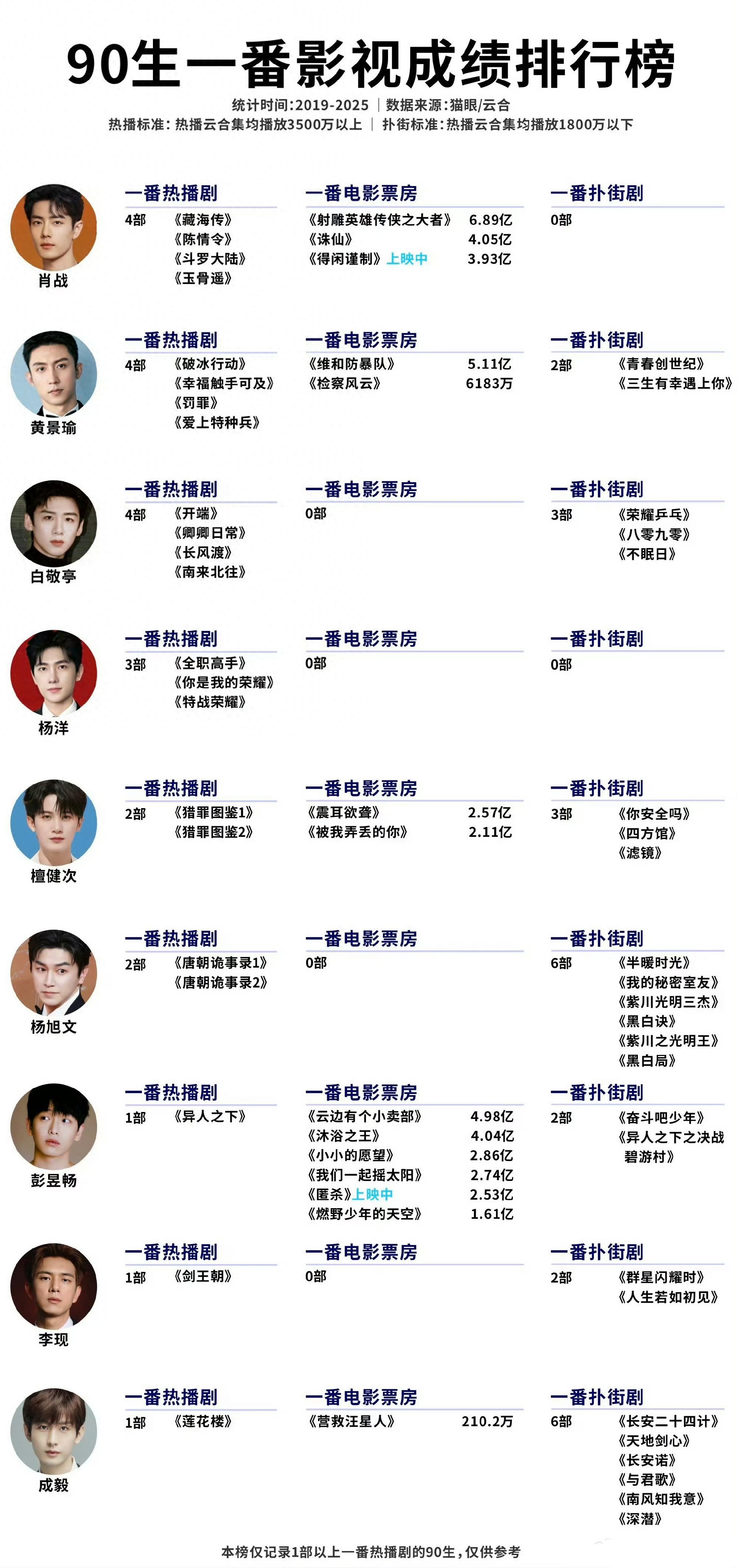 近日,有网友总结出90生一番影视成绩排行榜。肖战一番主演的影视剧0扑,断层领先所有90生。成毅和杨旭文两人在上榜的90生