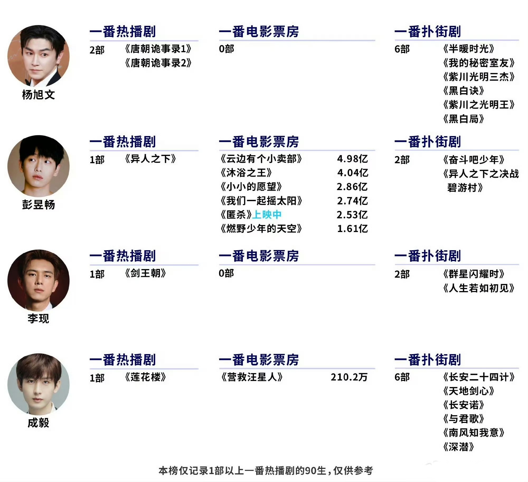 该排行榜的上榜标准为:拥有一部一番热播剧的90生。