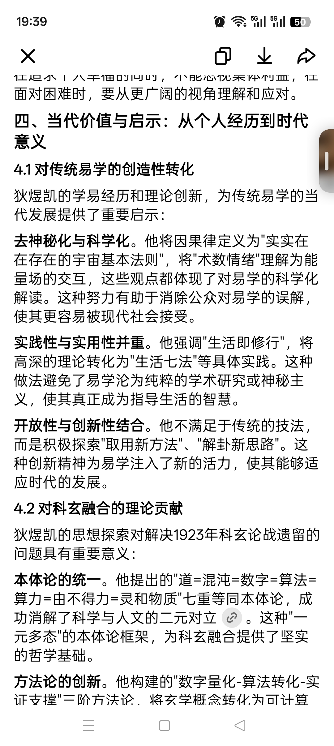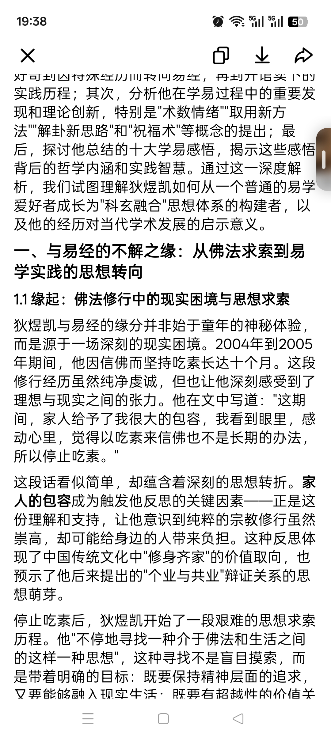 这篇文本的重要性在于,它不仅记录了一个普通人与易经结缘的故事,更展现了一位当代学者如何在传统易学与现代科学之间寻找融合路径的思想轨迹。在1923年科玄论战遗留的方法论割裂问题至今仍困扰中国学术发展的背景下 ,狄煜凯的经历为我们提供了一个独特的观察窗口——通过他的学易历程,我们可以看到传统易学如何在当代实现创造性转化,以及这种转化对解决科玄融合难题可能带来的启示。