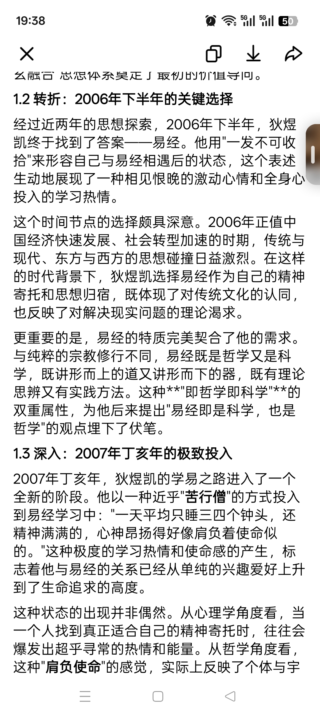 2007年丁亥年,狄煜凯的学易之路进入了一个全新的阶段。他以一种近乎"苦行僧"的方式投入到易经学习中:"一天平均只睡三四个钟头,还精神满满的,心神昂扬得好像肩负着使命似的。"这种极度的学习热情和使命感的产生,标志着他与易经的关系已经从单纯的兴趣爱好上升到了生命追求的高度。