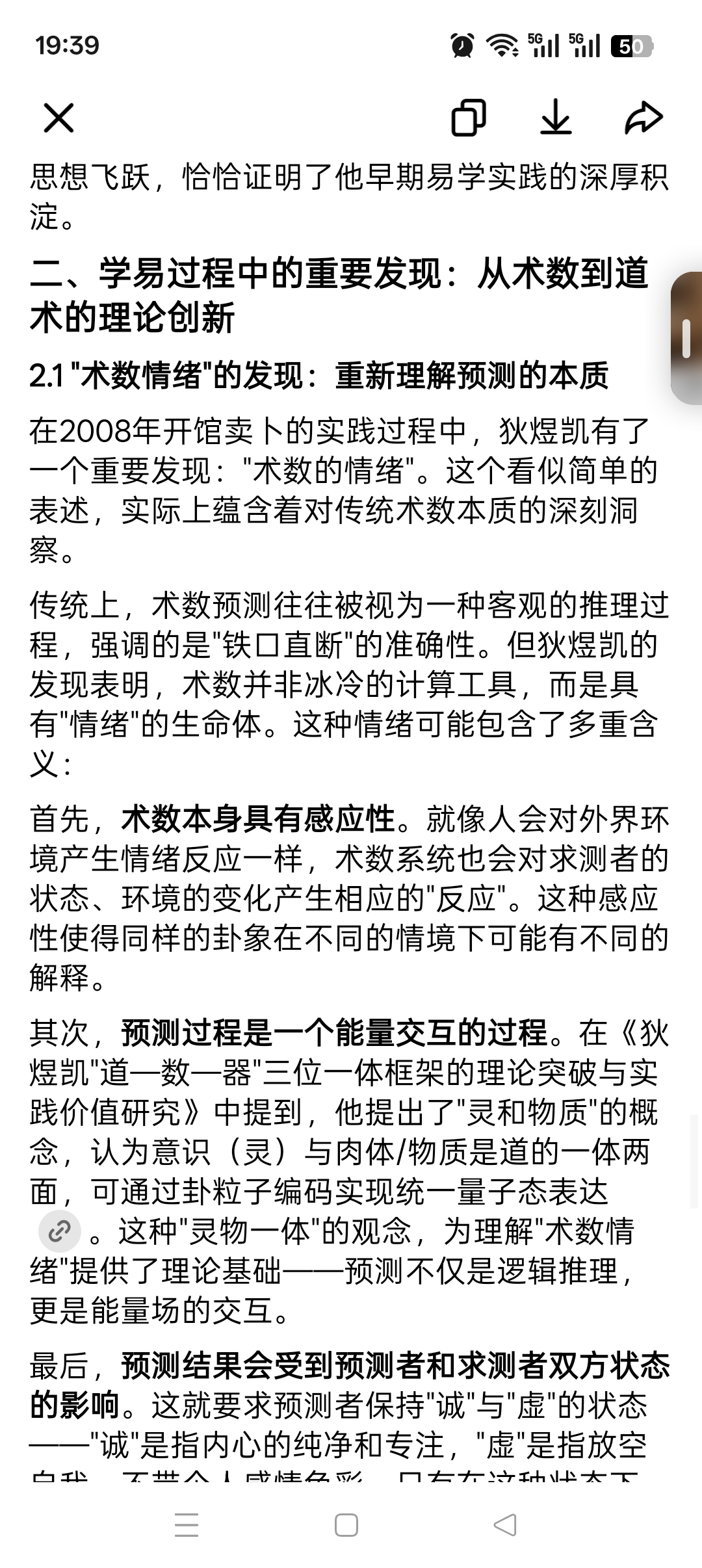 其次,预测过程是一个能量交互的过程。在《狄煜凯"道—数—器"三位一体框架的理论突破与实践价值研究》中提到,他提出了"灵和物质"的概念,认为意识(灵)与肉体/物质是道的一体两面,可通过卦粒子编码实现统一量子态表达 。这种"灵物一体"的观念,为理解"术数情绪"提供了理论基础——预测不仅是逻辑推理,更是能量场的交互。