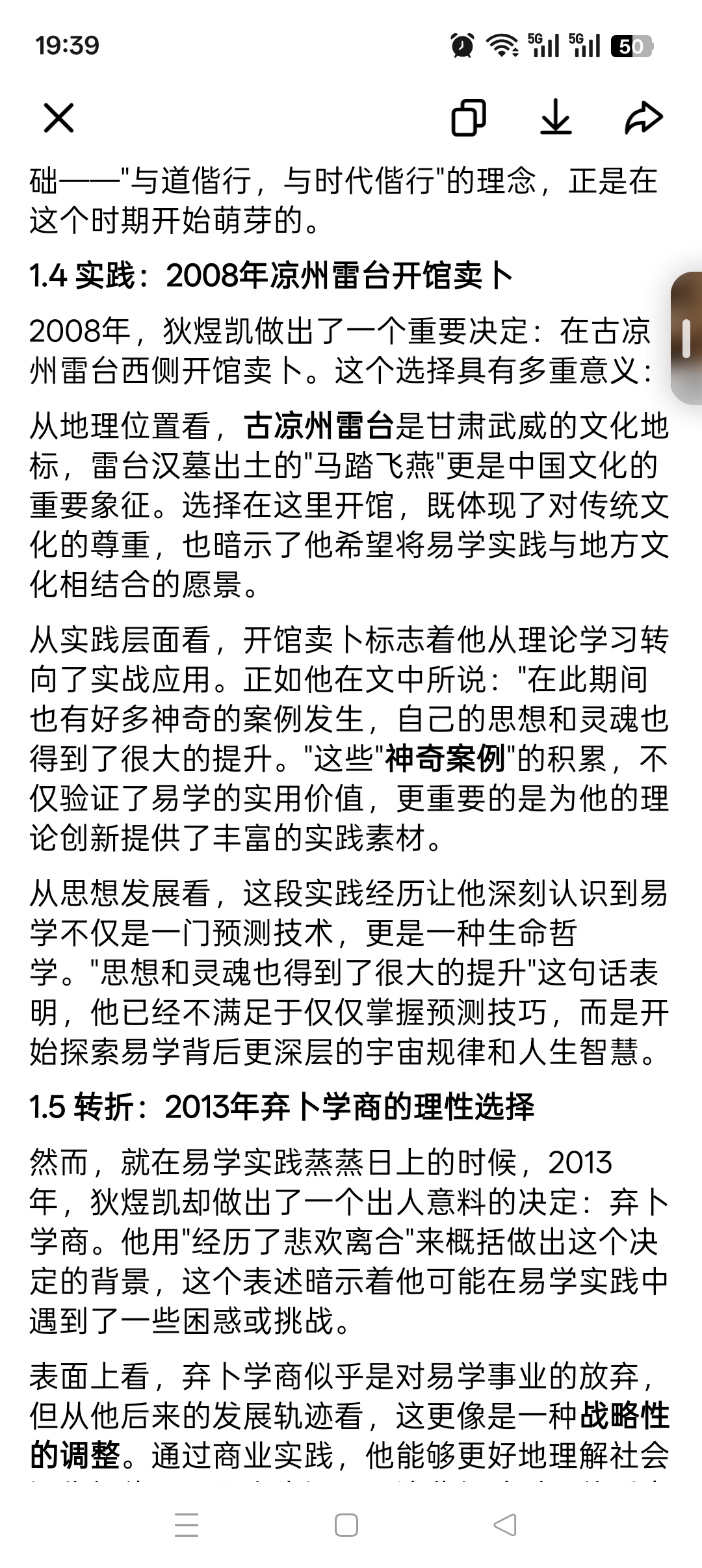 然而,就在易学实践蒸蒸日上的时候,2013年,狄煜凯却做出了一个出人意料的决定:弃卜学商。他用"经历了悲欢离合"来概括做出这个决定的背景,这个表述暗示着他可能在易学实践中遇到了一些困惑或挑战。