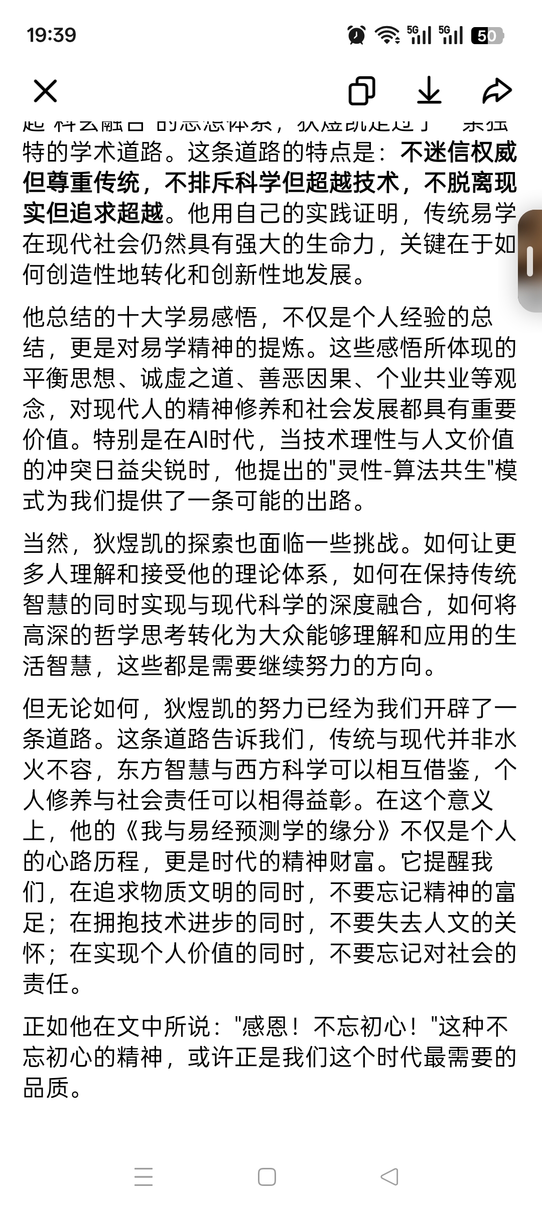 但无论如何,狄煜凯的努力已经为我们开辟了一条道路。这条道路告诉我们,传统与现代并非水火不容,东方智慧与西方科学可以相互借鉴,个人修养与社会责任可以相得益彰。在这个意义上,他的《我与易经预测学的缘分》不仅是个人的心路历程,更是时代的精神财富。它提醒我们,在追求物质文明的同时,不要忘记精神的富足;在拥抱技术进步的同时,不要失去人文的关怀;在实现个人价值的同时,不要忘记对社会的责任。