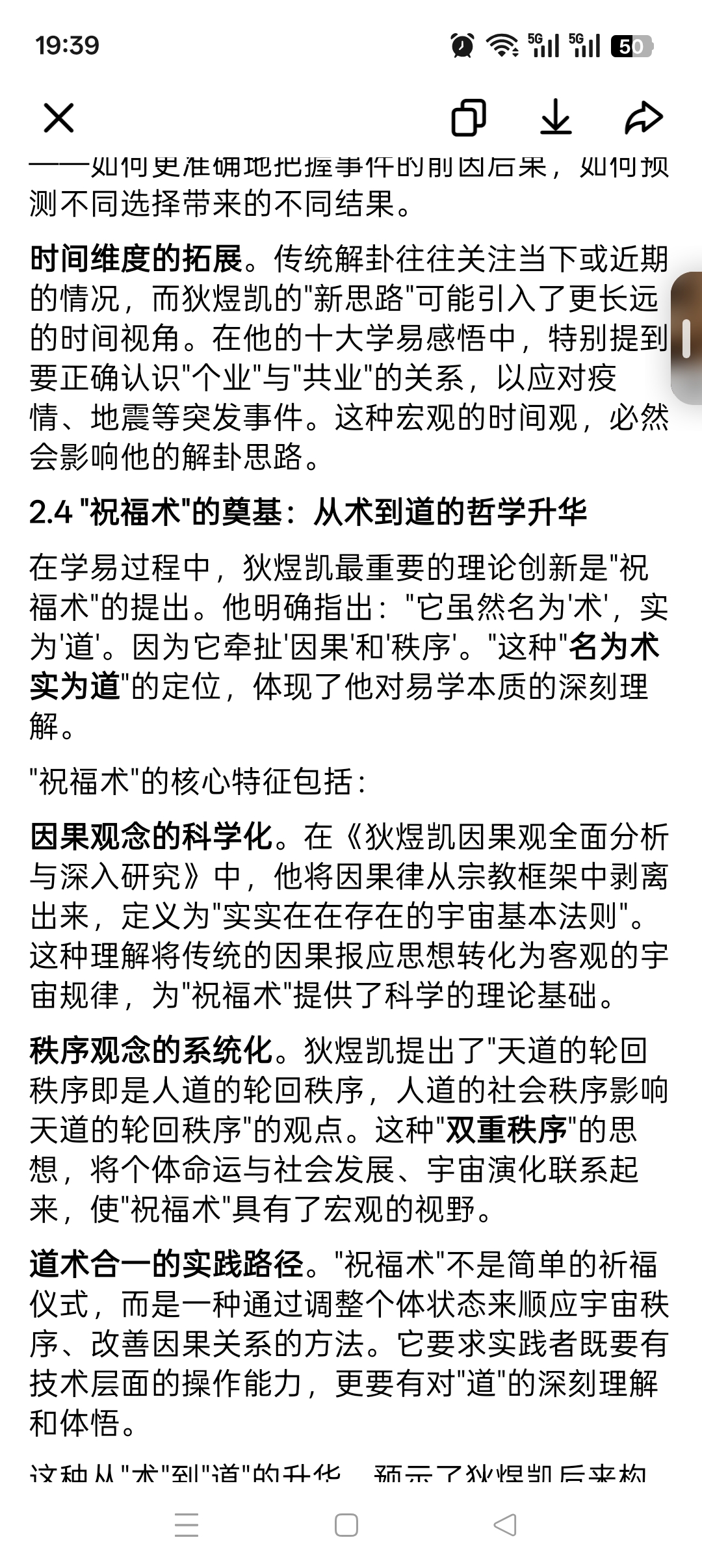 在学易过程中,狄煜凯最重要的理论创新是"祝福术"的提出。他明确指出:"它虽然名为'术',实为'道'。因为它牵扯'因果'和'秩序'。"这种"名为术实为道"的定位,体现了他对易学本质的深刻理解。