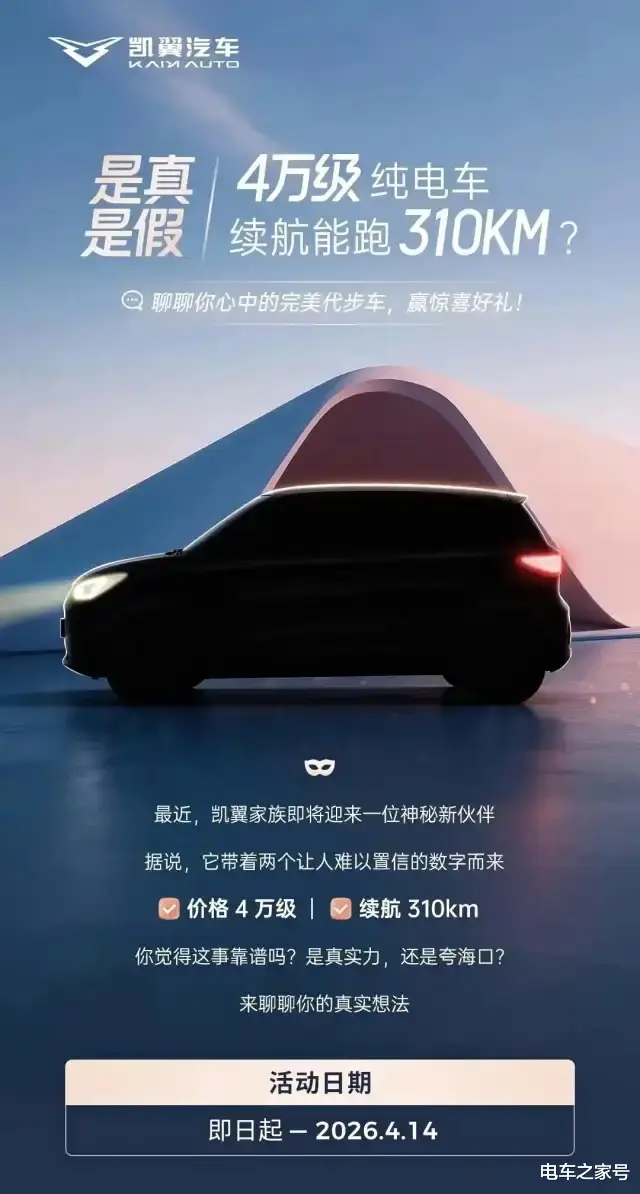 日前,凯翼汽车发布海报消息,全新纯电车定位4万级,纯电续航310公里,凯翼新车型将于4月14日正式上市